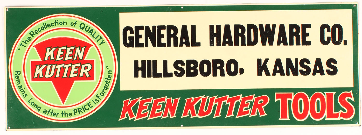 Keen Kutter Tin Sign is embossed, General Hardware Co. Hillsboro, KS, 28'' x 10'', bright colors. Grade: Excellent ++ - Value: 80 to 300