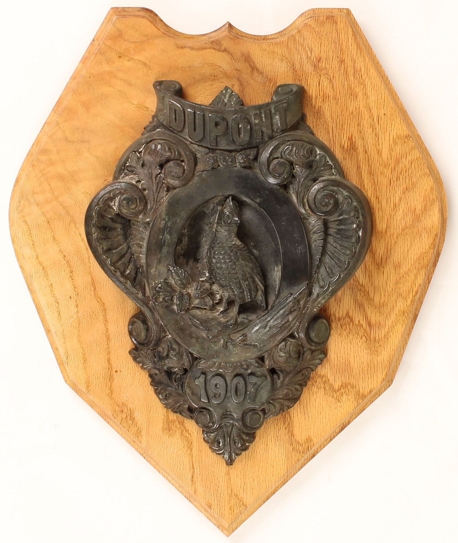 RARE Dupont Bronze 1917 Trophy or Door Decoration, deeply engraved heavy metal has quail at center, mounted on wood, metal trophy measures 8'' x 10'', has three mounted creases on back, these were given out at shooting events. Grade: Excellent + - Value: 250 to 600