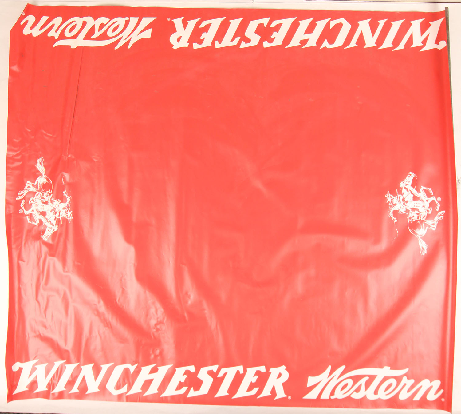 Winchester Table Banner, red & white, no foam on back, 54'' x 47'', shows some marks otherwise nice condition. Grade: Excellent - Value: 50 to 250