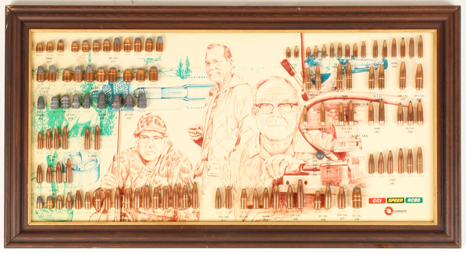 Speer Bullet Board, pictures founders Vernon Speer, Fred Huntington & Richard Speer, all bullets intact, has original wrapping, 21 1/2'' wide. Grade: Excellent + - Value: 100 to 300