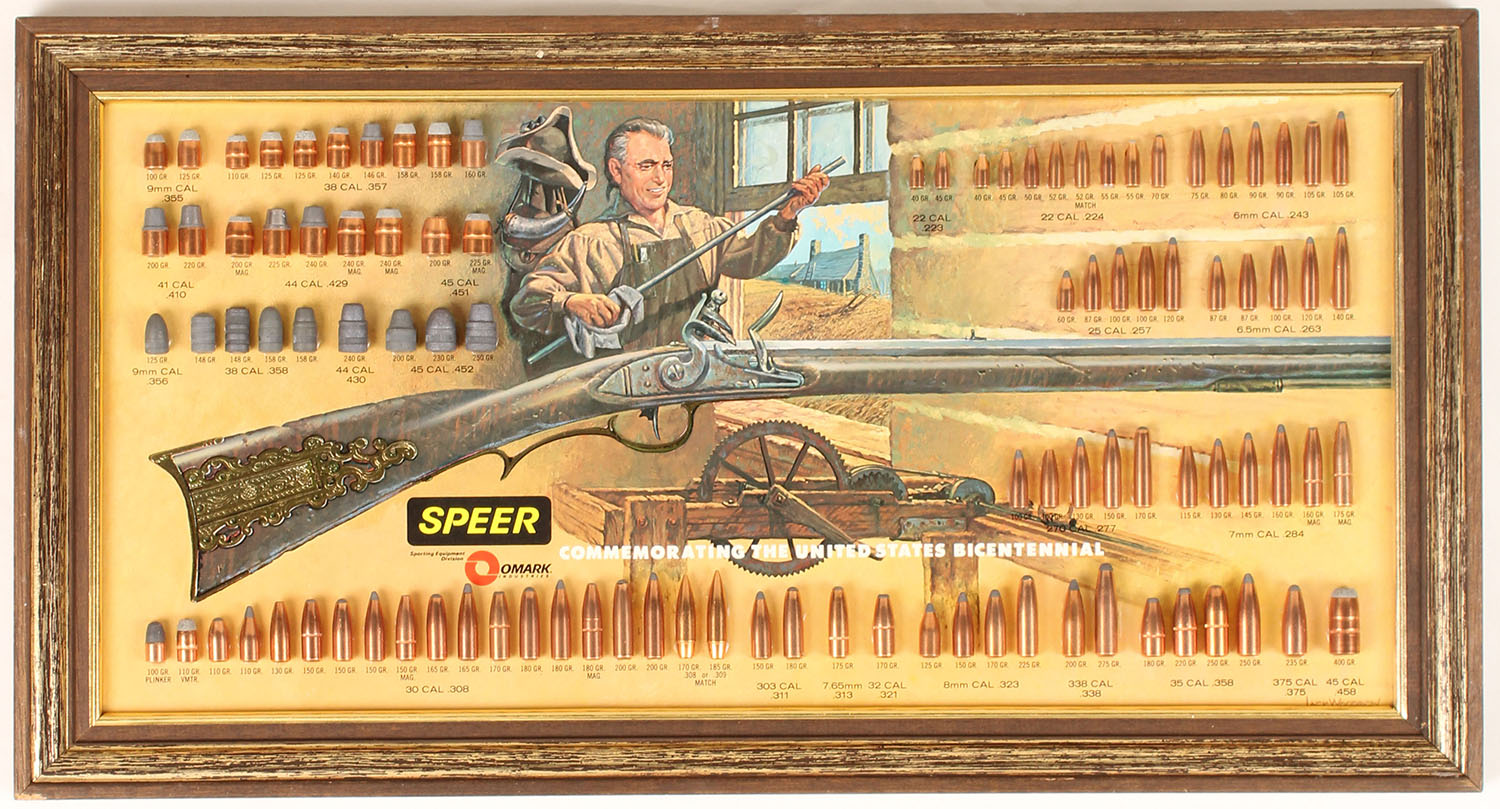 Speer Bullet Board, pictures Pennsylvania Kentucky Rifle being cleaned by frontiersman, all bullets intact. Grade: Excellent + - Value: 100 to 300