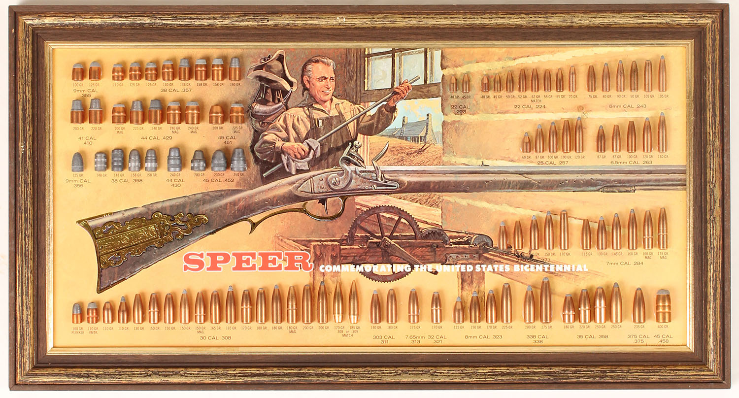 Speer Bullet Board, pictures Pennsylvania Kentucky Rifle being cleaned by frontiersman, all bullets intact, slightly different with the Speer in red not black. Grade: Excellent + - Value: 100 to 300