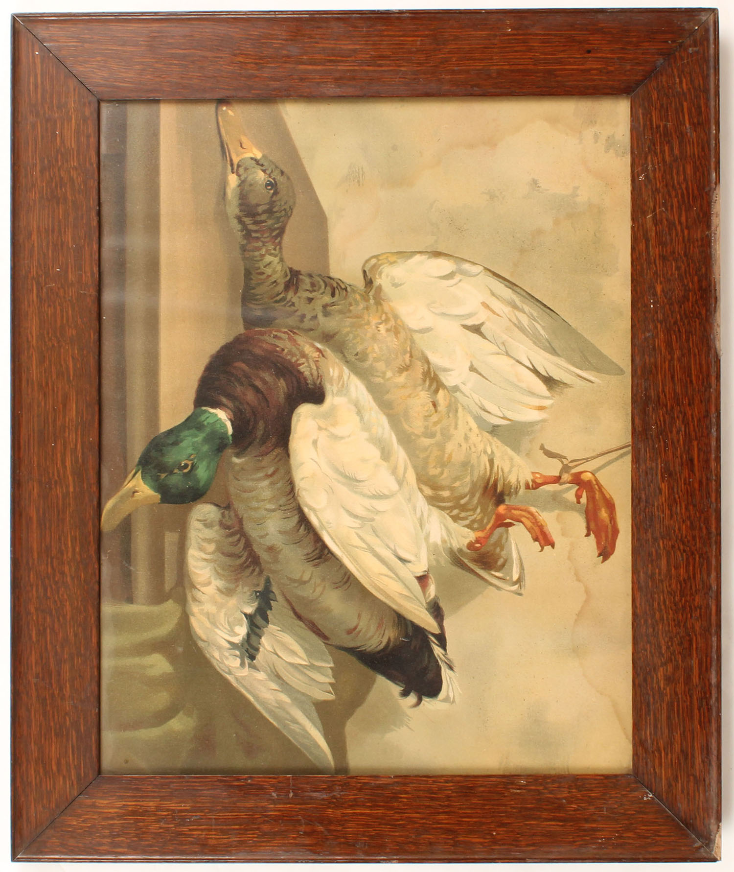 Hanging print pictures full color image of Specklebelly Goose & a Mallard hanging, artist us unknown, has slight water stain to top & left otherwise great colors, framed, 19'' x 15'' image size. Grade: Very Good ++ - Value: 50 to 250