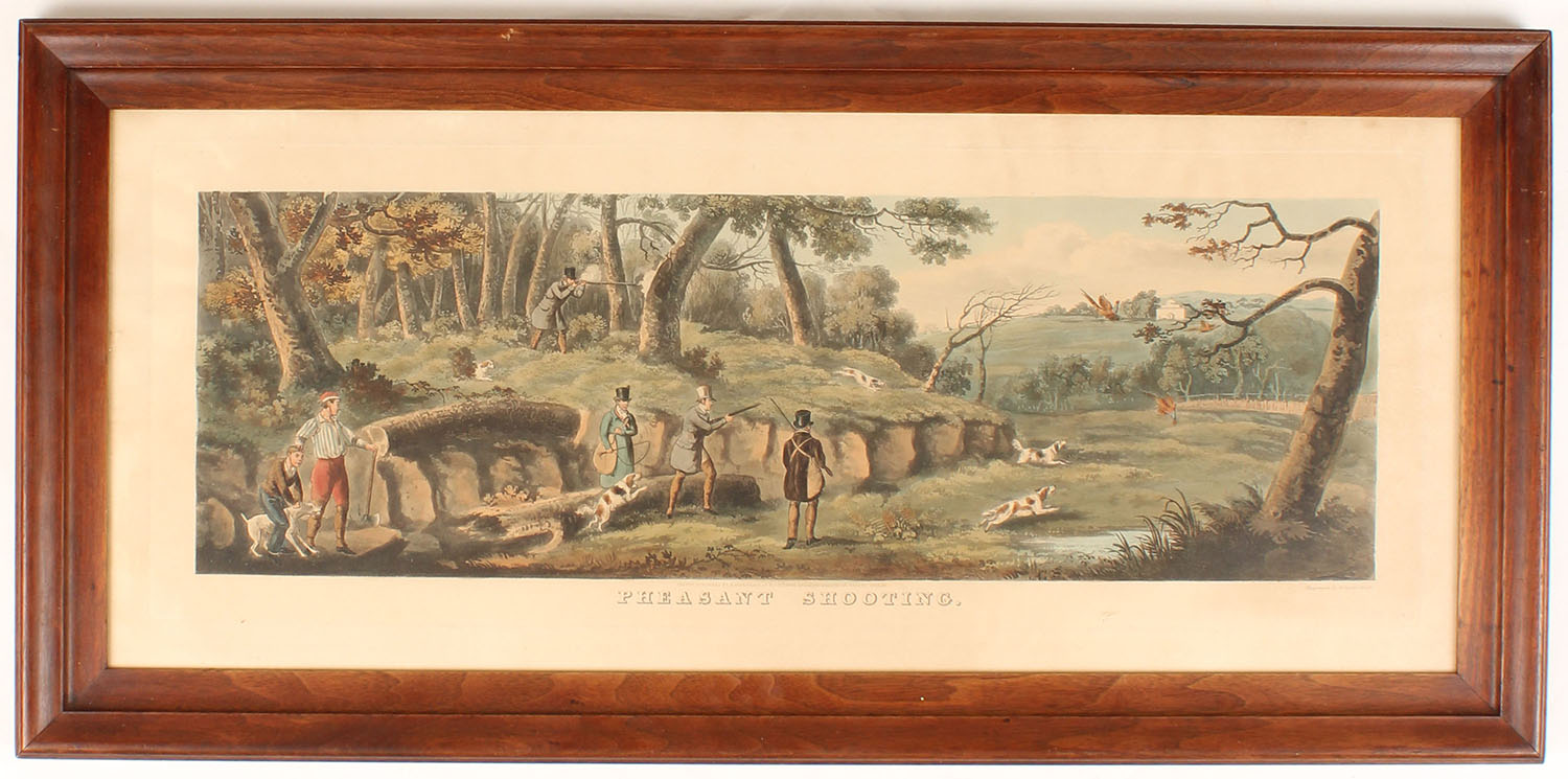 Early PHEASANT SHOOTING print, engraved by T. Sutherland, Published by R. Ackermann at his Eclipse Sporting Gallery London, full color image of hunters shooting at three rooster pheasants with dog chasing, framed, 25 1/2'' x 8 1/2'' image size. Grade: Excellent - Value: 100 to 500