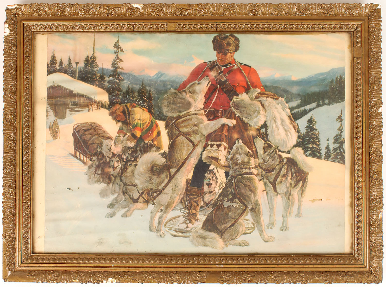 Canadian Royal Mounted Police with dog sled team in snow scene, framed, has some scuffing, 23'' x 17''. Grade: Very Good - Value: 10 to 100