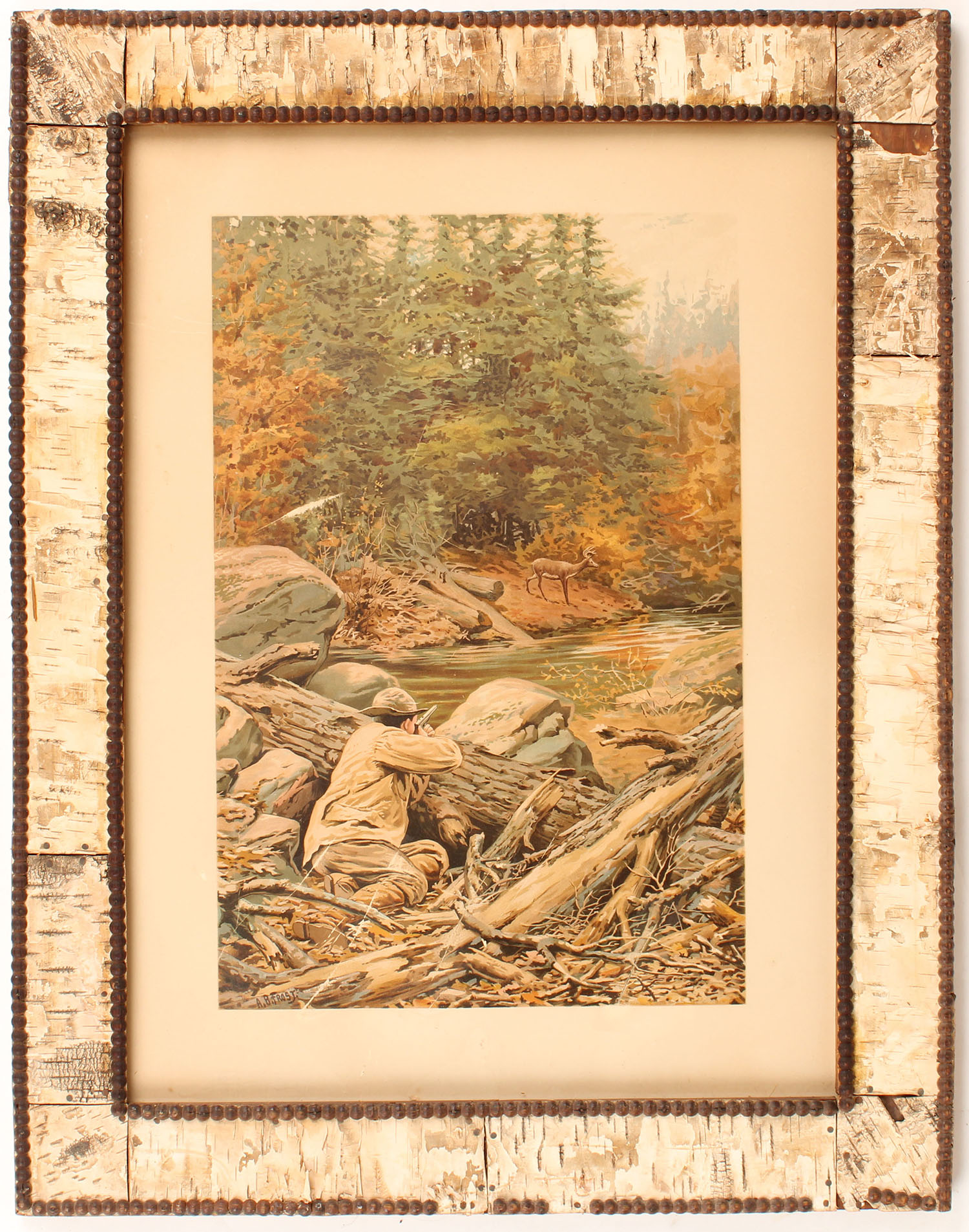 1890 A.B Frost lithograph that pictures hunter shooting at deer at rivers edge, nice full color image, has a few scratches, framed in period frame, 12'' x 18'' image size - Value: 50 to 200