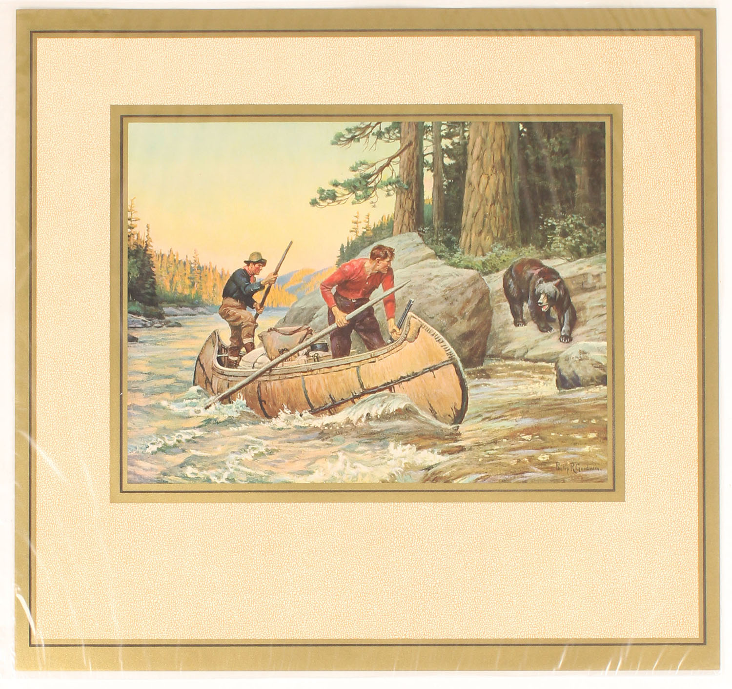 Philip R. Goodwin print pictures two hunters in canoe with black bear surprising them from shore, 12'' x 9'' image size. Grade: Excellent ++ - Value: 50 to 200