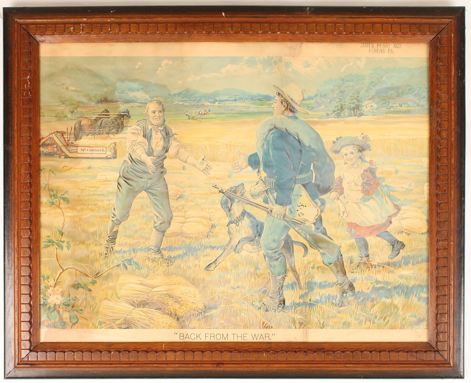 Mc Cormick farm equipment print ''BACK FROM THE WAR'', pictures son returning home to the farm to meet his day & sister from Spanish American War, circa 1900, 26'' x 18'' image size, framed, shows some wear. Grade: Very Good ++ - Value: 20 to 200