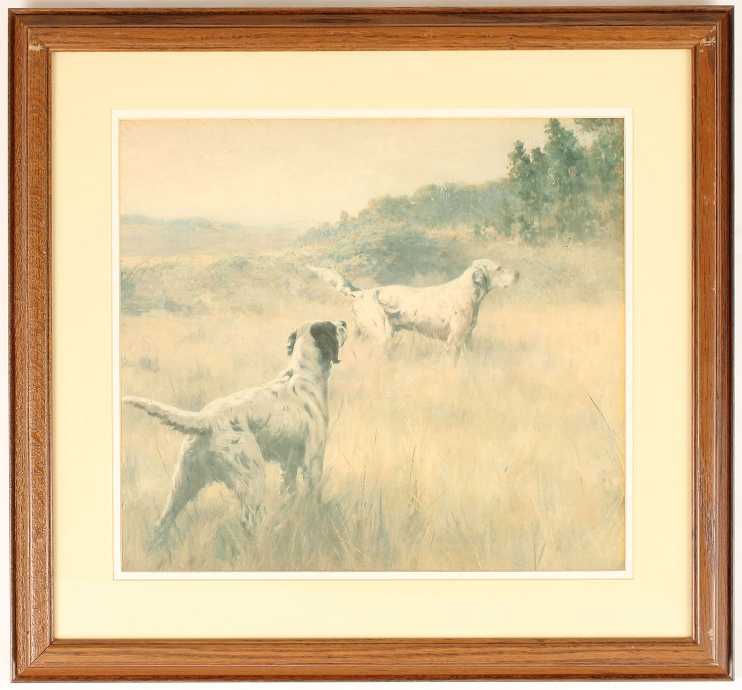 Print of two hunting dogs on point, unknown artist, framed & matted, 15'' x 13 1/2'' image size. Grade: Excellent - Value: 10 to 50