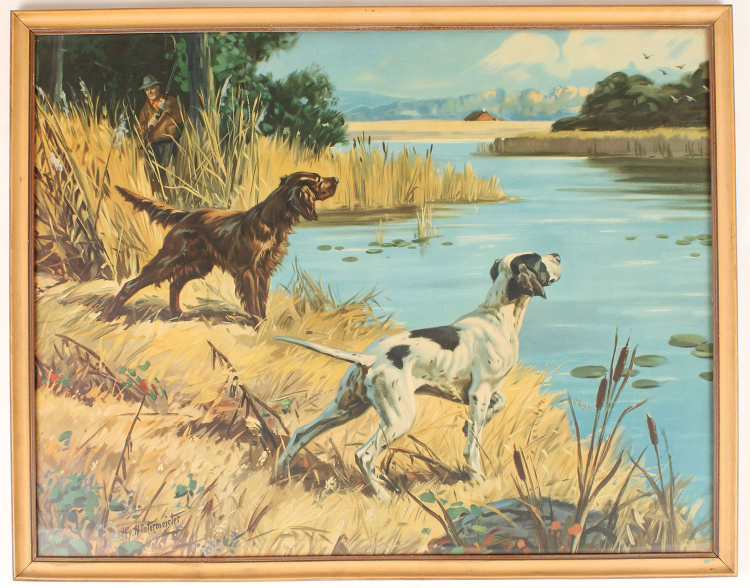 Hy Hintermeister print shows two dogs on point with hunter in background & birds in flight, 27'' x 21'' image size, framed. Grade: Excellent - Value: 10 to 50