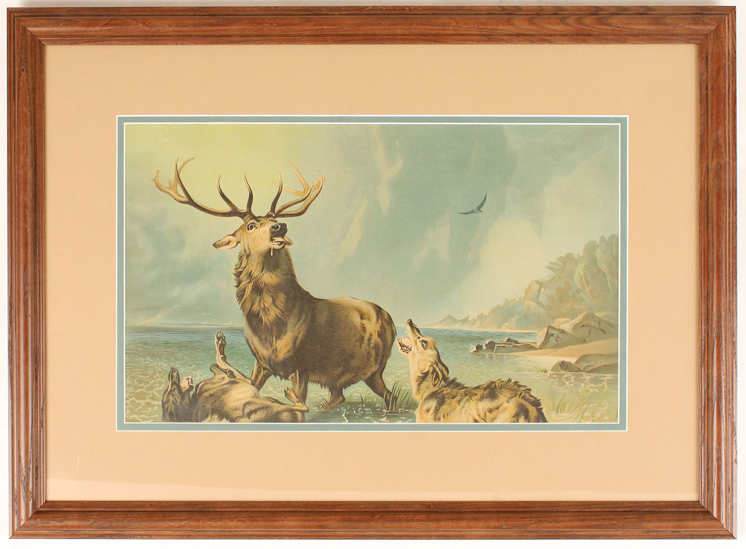 Elk being attacked by wolves on lakes edge, artist unknown, 17 1/2'' x 11'', framed & matted. Grade: Excellent - Value: 10 to 50