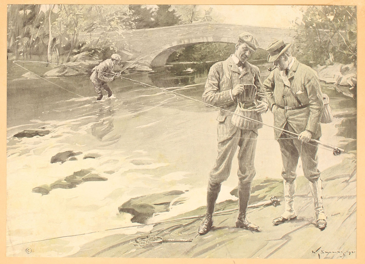 W. Smicble print of fly fishermen looking inside of creel with rods, reels & nets, 16'' x 11'', has tear to top right. Grade: Very Good ++ - Value: 10 to 50