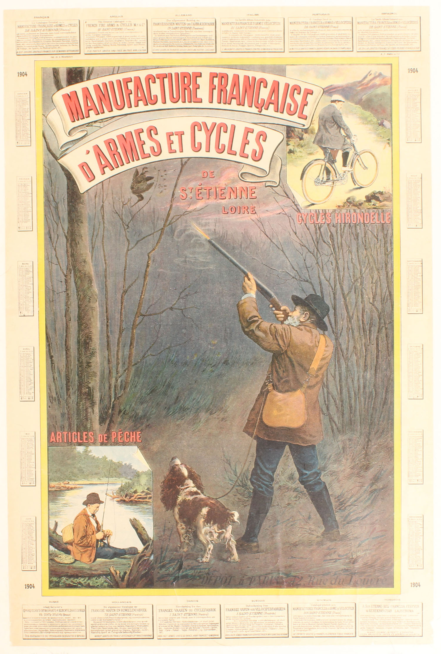1904 Manufacture Francaise d'Armes et Cycles, pictures a great full color image of hunter & his dog shooting in the woods at snipe, plus a fishing scene & a bicycle scene, 18'' x 27''. Grade: Excellent - Value: 30 to 400