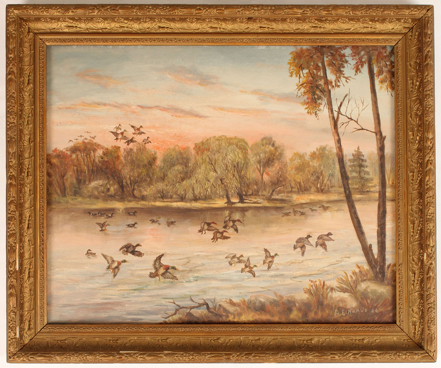 A.E. Kraus (Engraver for L.C. Smith (Hunter Arms) original Oil on board, pictures mallards & canvasbacks landing on water, 20'' x 16'' image size, framed, also includes in persona easel he used to paint & drawn on. Grade: Excellent - Value: 500 to 1500