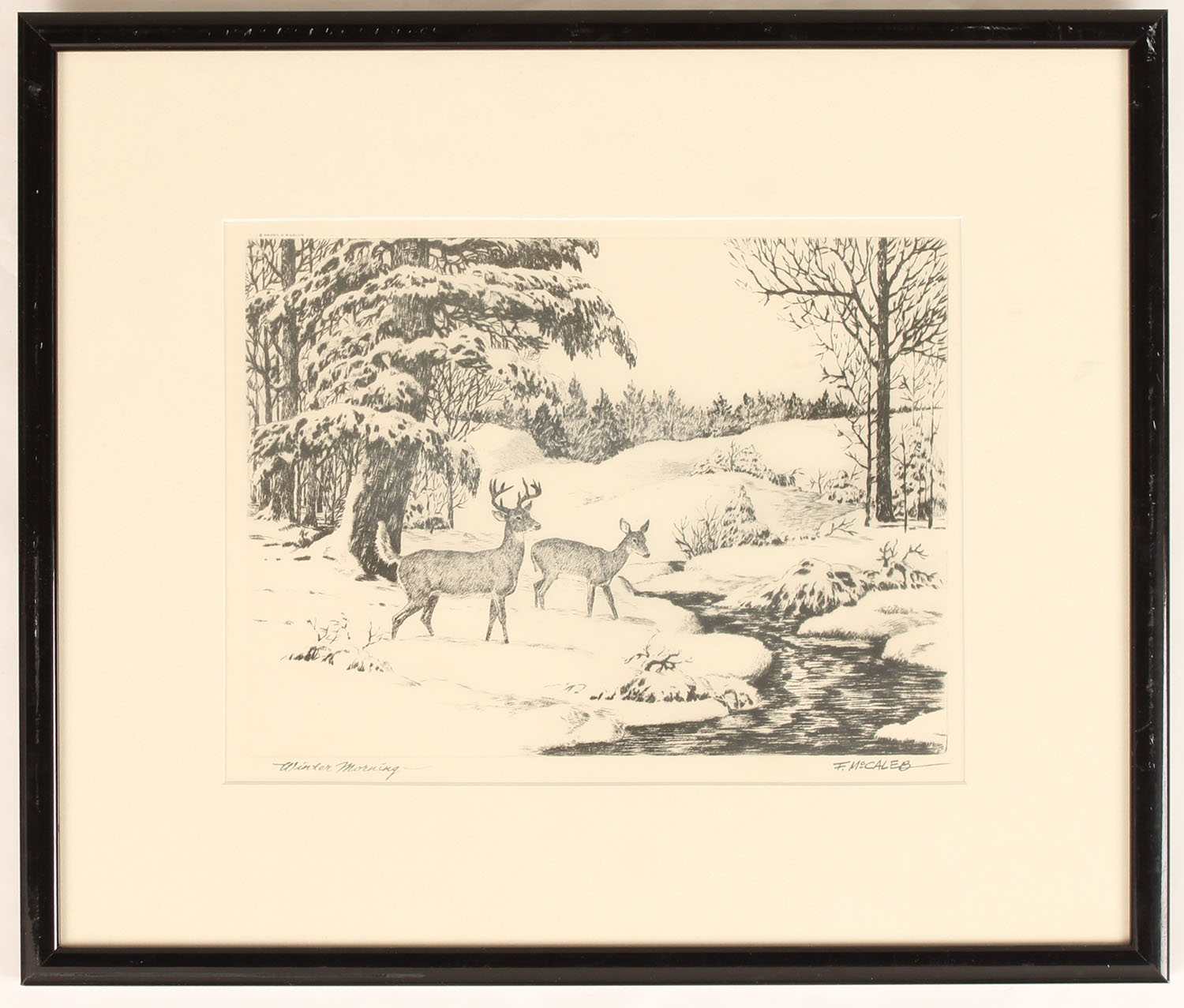 Winter Morning by F. McCaleb print of buck & doe on snowy rivers edge, 10'' x 7 1/2'' image size, framed. Grade: Excellent - Value: 10 to 100