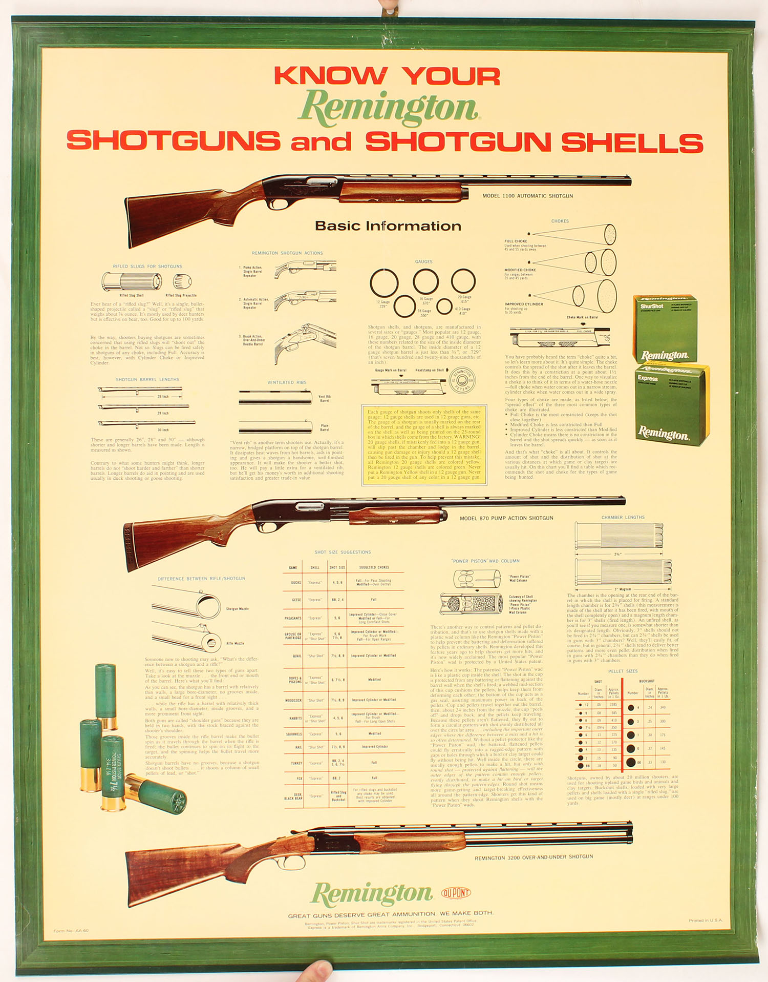 Remington KNOW YOUR REMINGTON SHOTGUN & SHOTGUN SHELLS Poster, pictures a full color image of many guns, has metal band top and bottom with brass hanger, (the full set could be purchased if you buy all of the ones in the next few lots), mint condition, 23'' x 29''. Grade: MINT - Value: 50 to 300