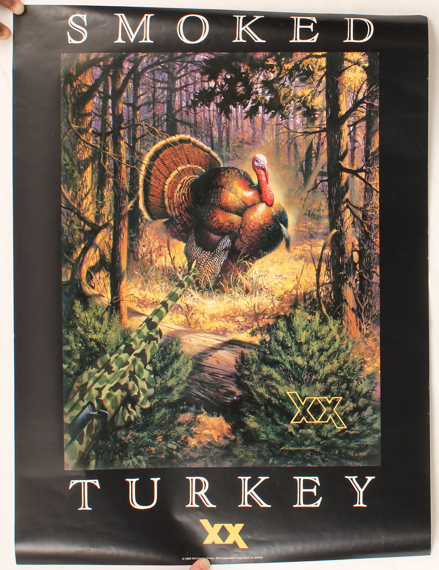 Winchester XX SMOKED TURKEY poster, pictures wild turkey just outside of a blind with a camo shotgun pointed right at him, 17'' x 23''. Grade: Excellent - Value: 10 to 200