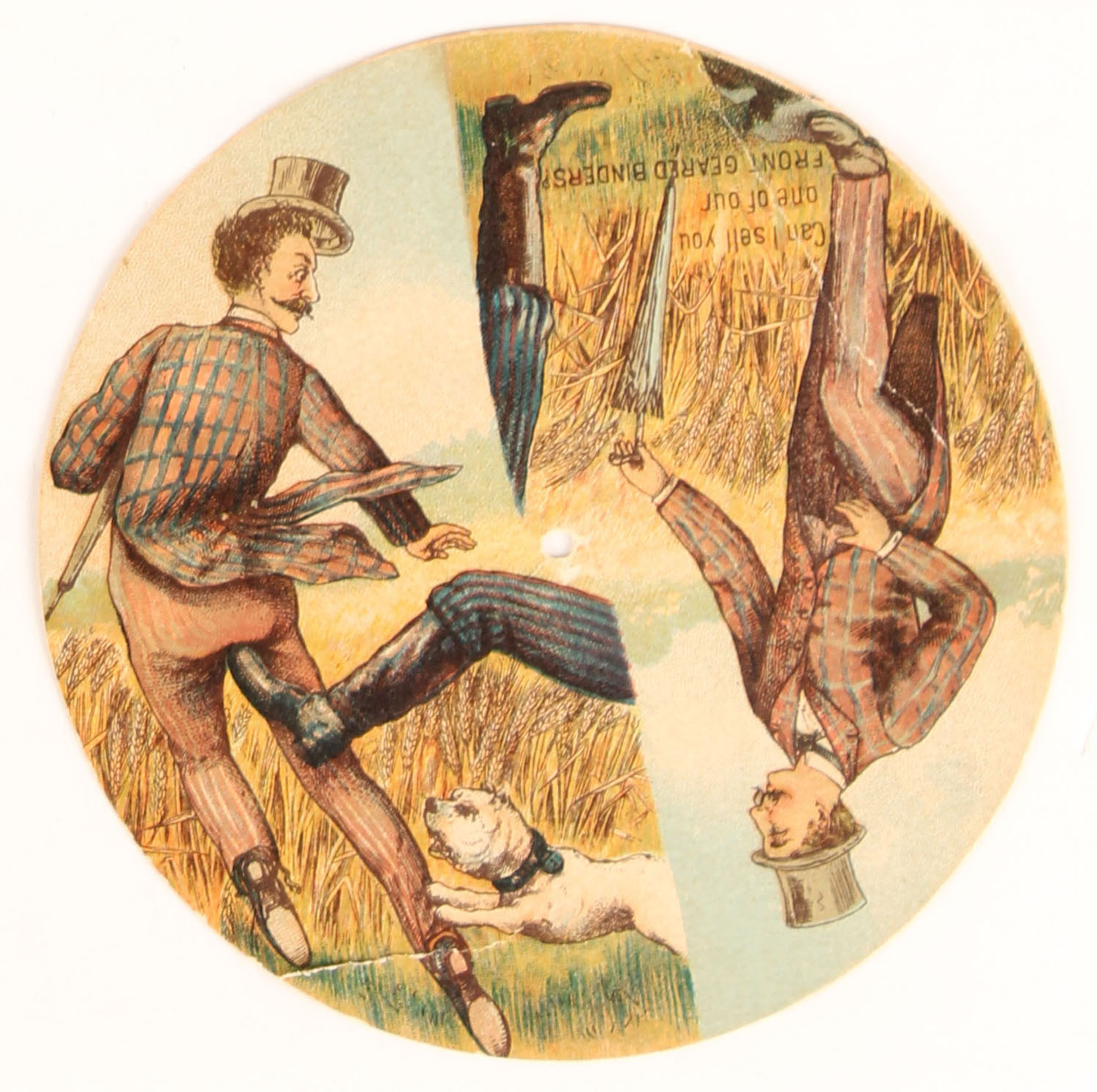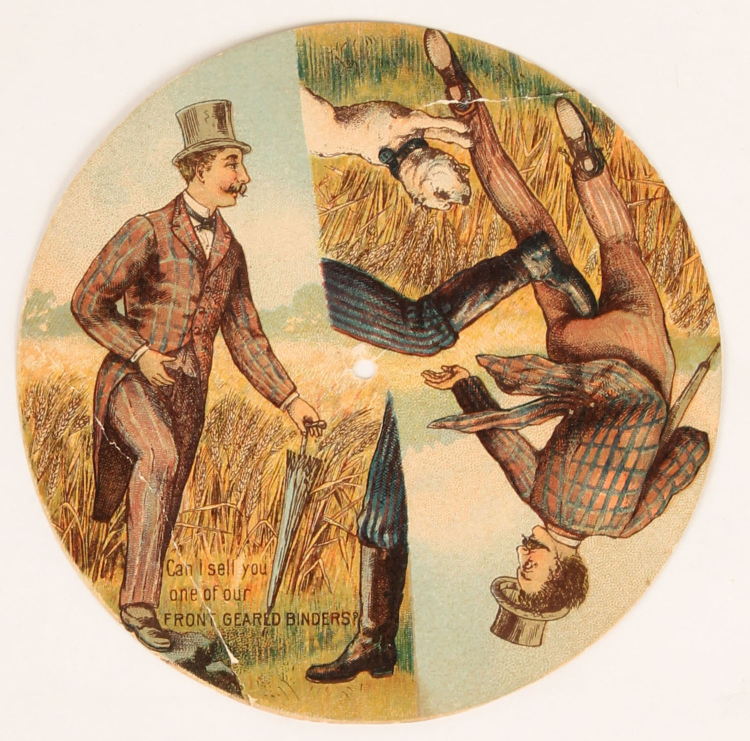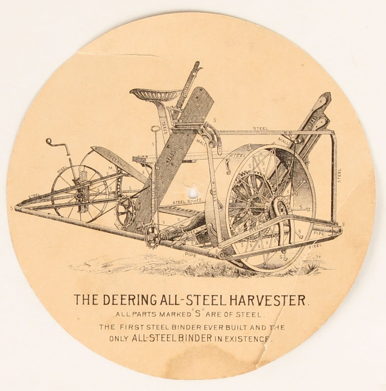 The Deering All-Steel Harvester adv. Card, one side of front pictures salesman trying to sell a farmer a Front Geared Binder, the other half shows the farmer kicking the salesman in the rear, the back side pictures the new harvester, 4 3/4''. Grade: Excellent - Value: 10 to 200