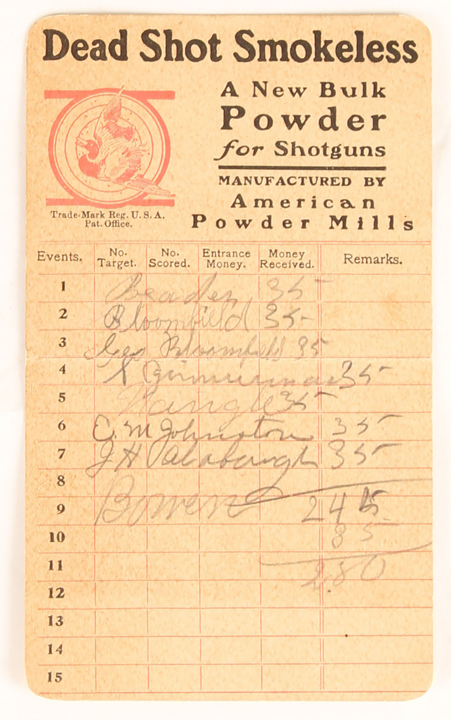Dead Shot Smokeless, American Powder Mills Score Card, used, back is blank with writing. Grade: Very Good ++ - Value: 10 to 100