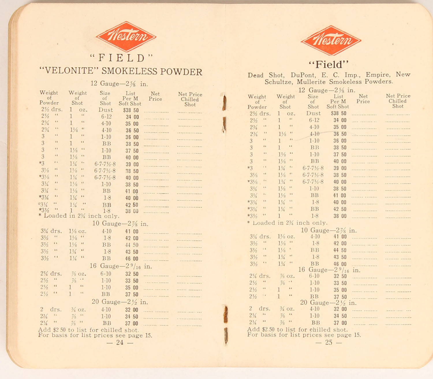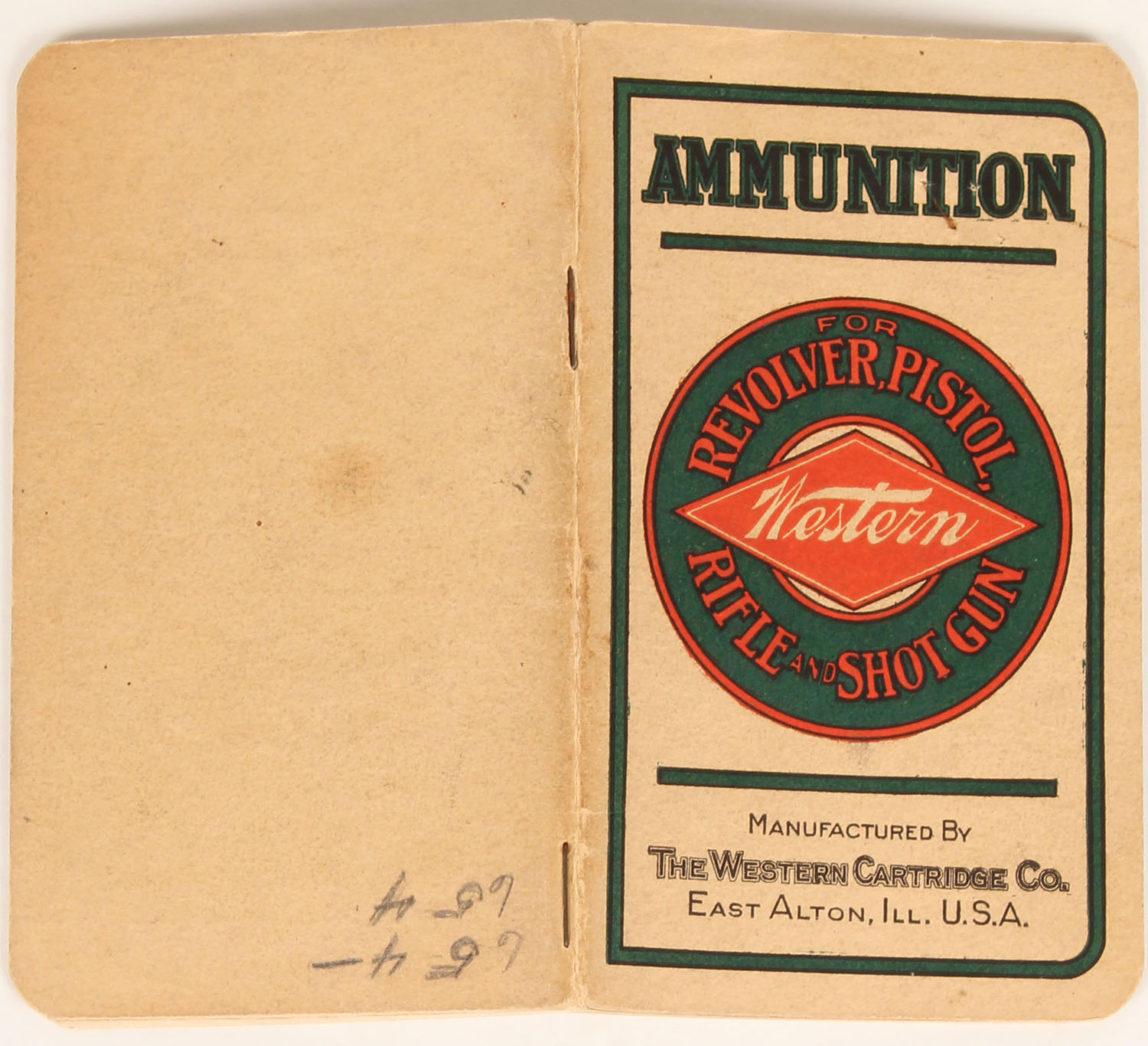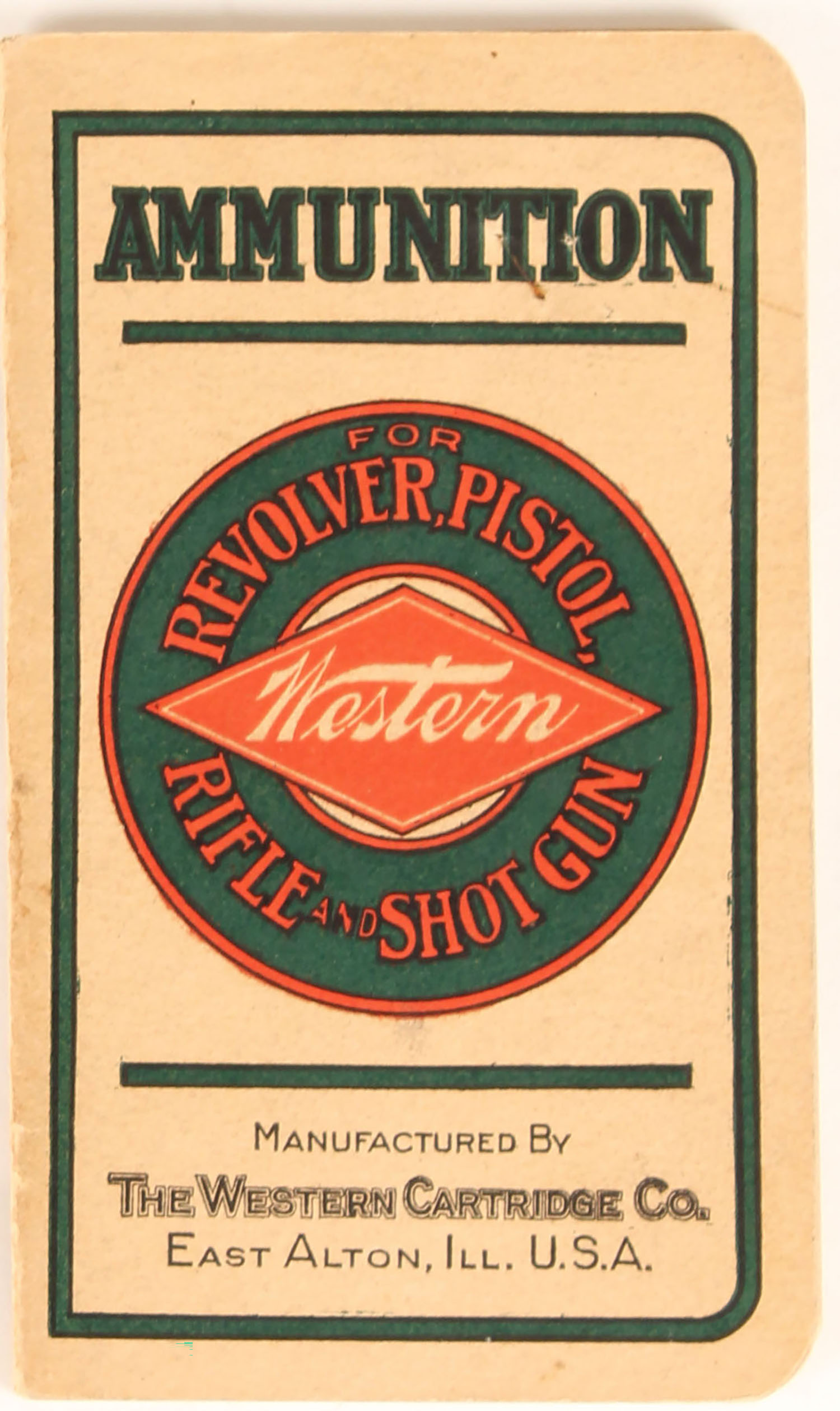 Western Revolver, Pistol, Rifle & Shotgun Booklet/price list, has many pages with images of 2pc shotshell boxes & window shells, 43 pages. Grade: Excellent - Value: 20 to 100