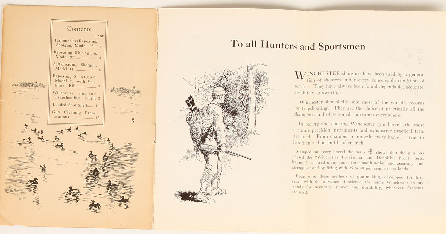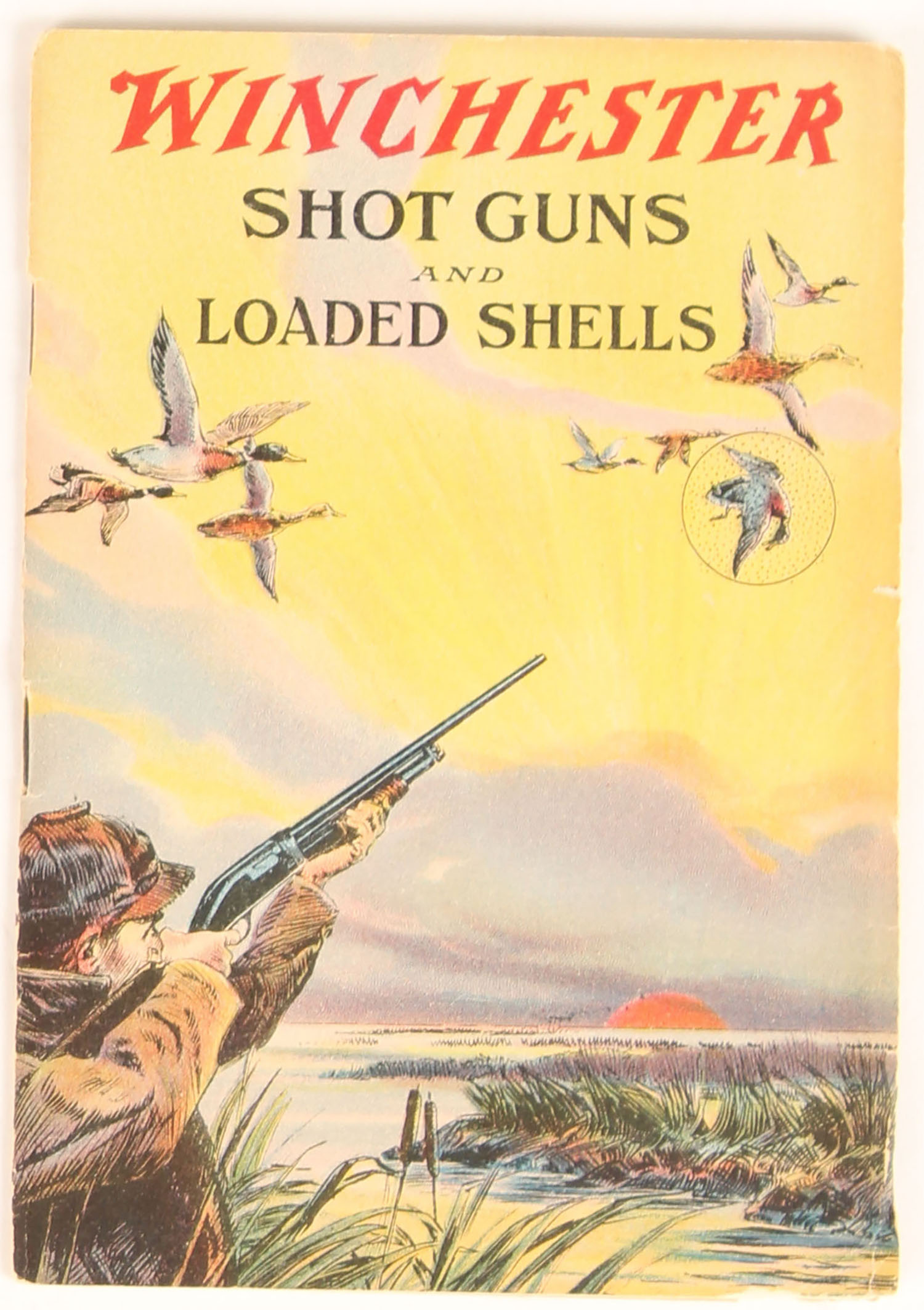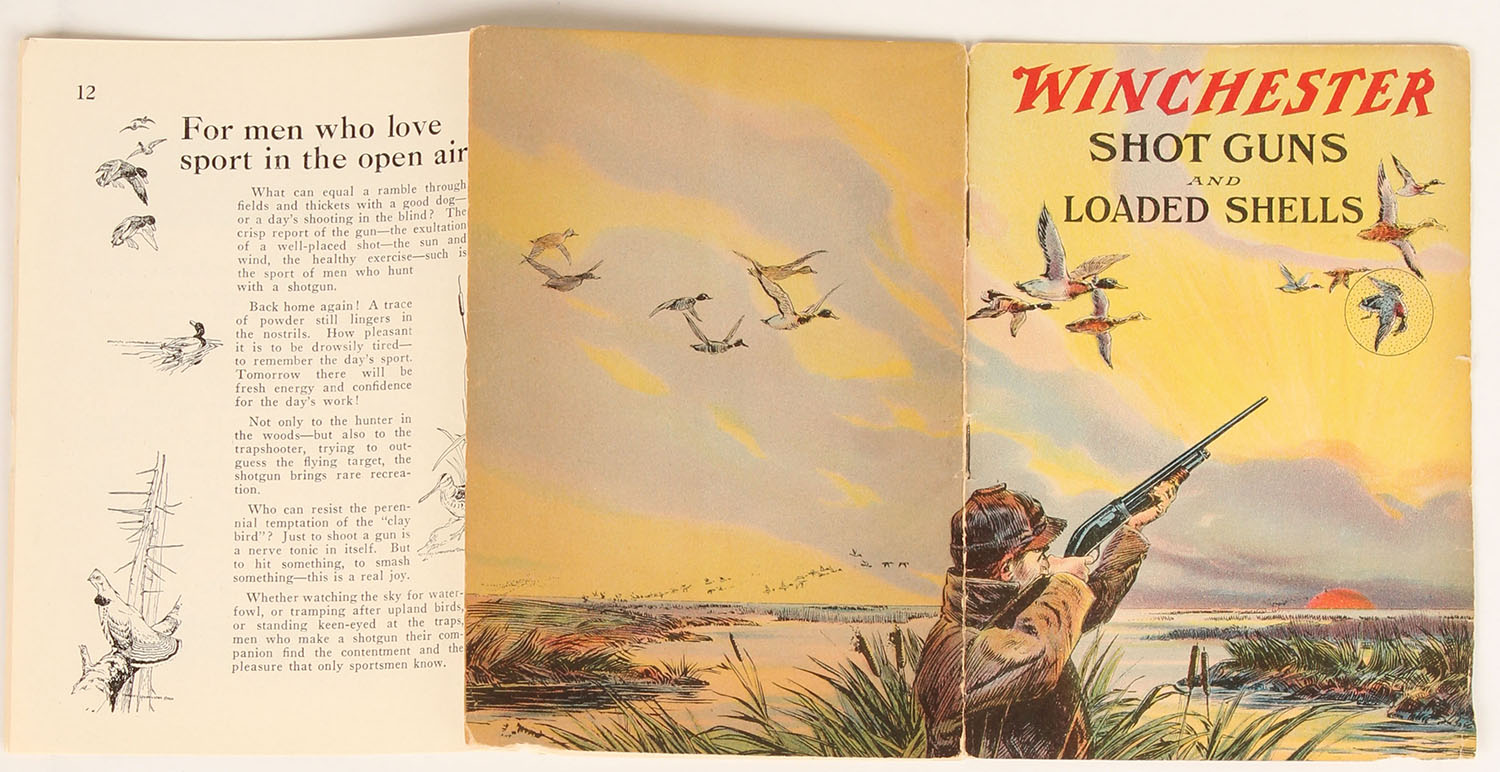 Winchester Shot Guns and Loaded Shells booklet, pictures a full color image of a duck hunting scene with mallards in flight, 12 pages, 4'' x 6'', shows a tear to binding. Grade: Excellent - Value: 40 to 200