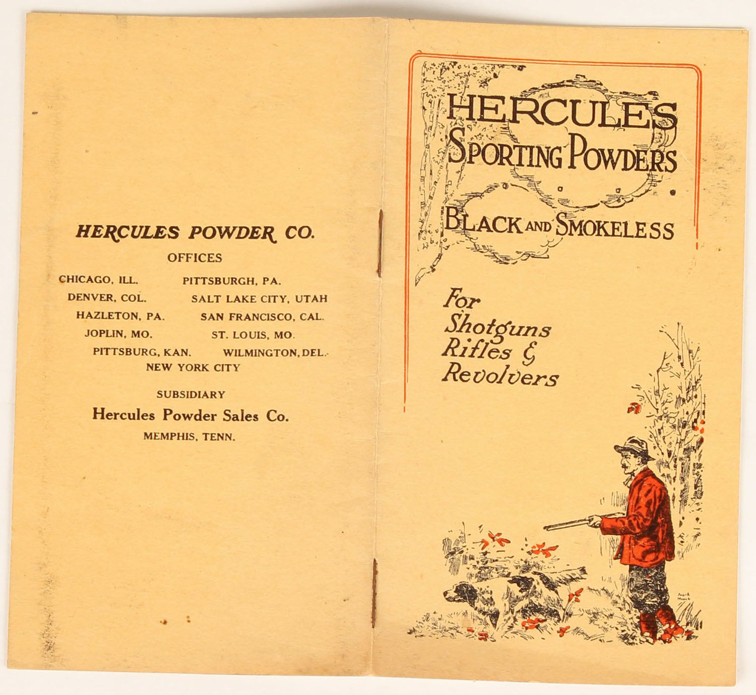 1914 Hercules Sporting Powders pocket catalog, pictures full powder cans, 20 pages. Grade: Excellent - Value: 10 to 50