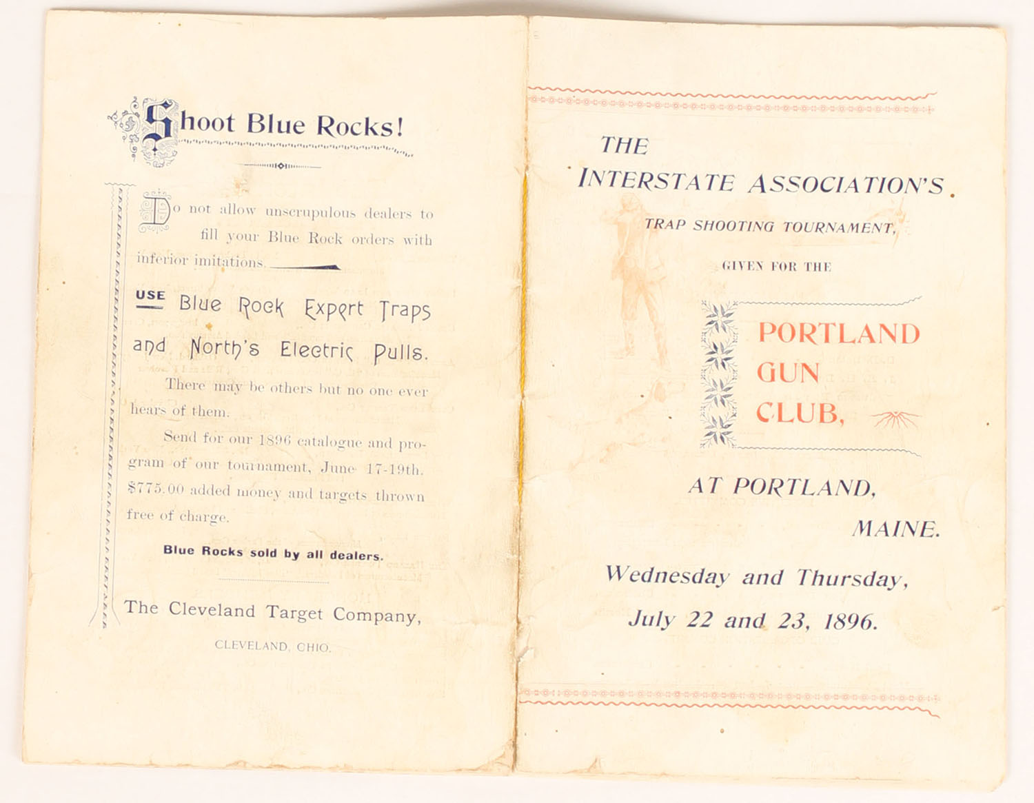 1896 Portland Maine Gun Club Trap shooting Tournament booklet, inside has lots of red printed adv for companies like UMC, VL&D, Leroy Shot and Lead Works, Hazard Powder Co., Schultze Powder Co., American E.C. Powder Co., Tatham & Brothers, Parker Bros. & Winchester, shows wear to binding & light age soiling. Grade: Very Good + - Value: 10 to 60