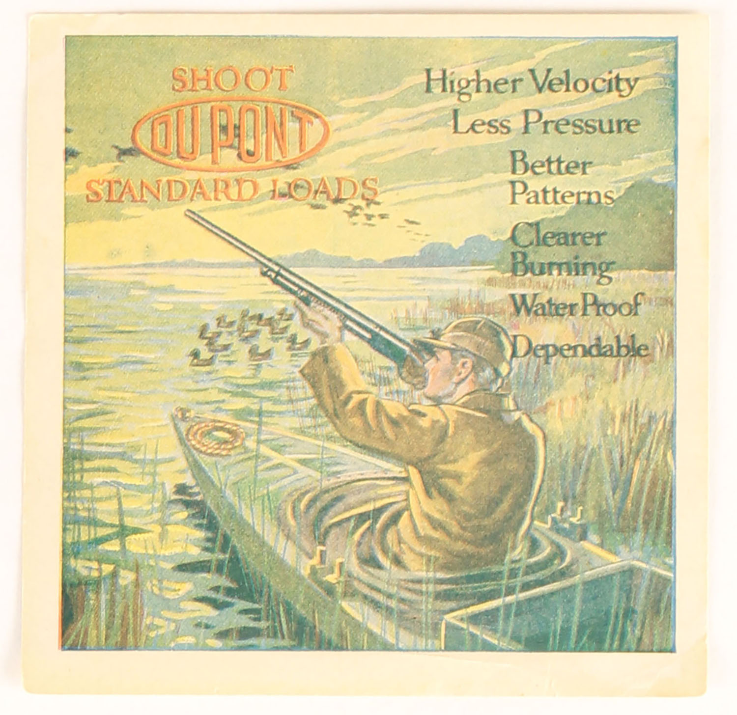 RARE Du PONT Standard Loads insert, has great full color image of duck hunter shooting out of boat over decoys, back has printing as well. Grade: Excellent ++ - Value: 100 to 300