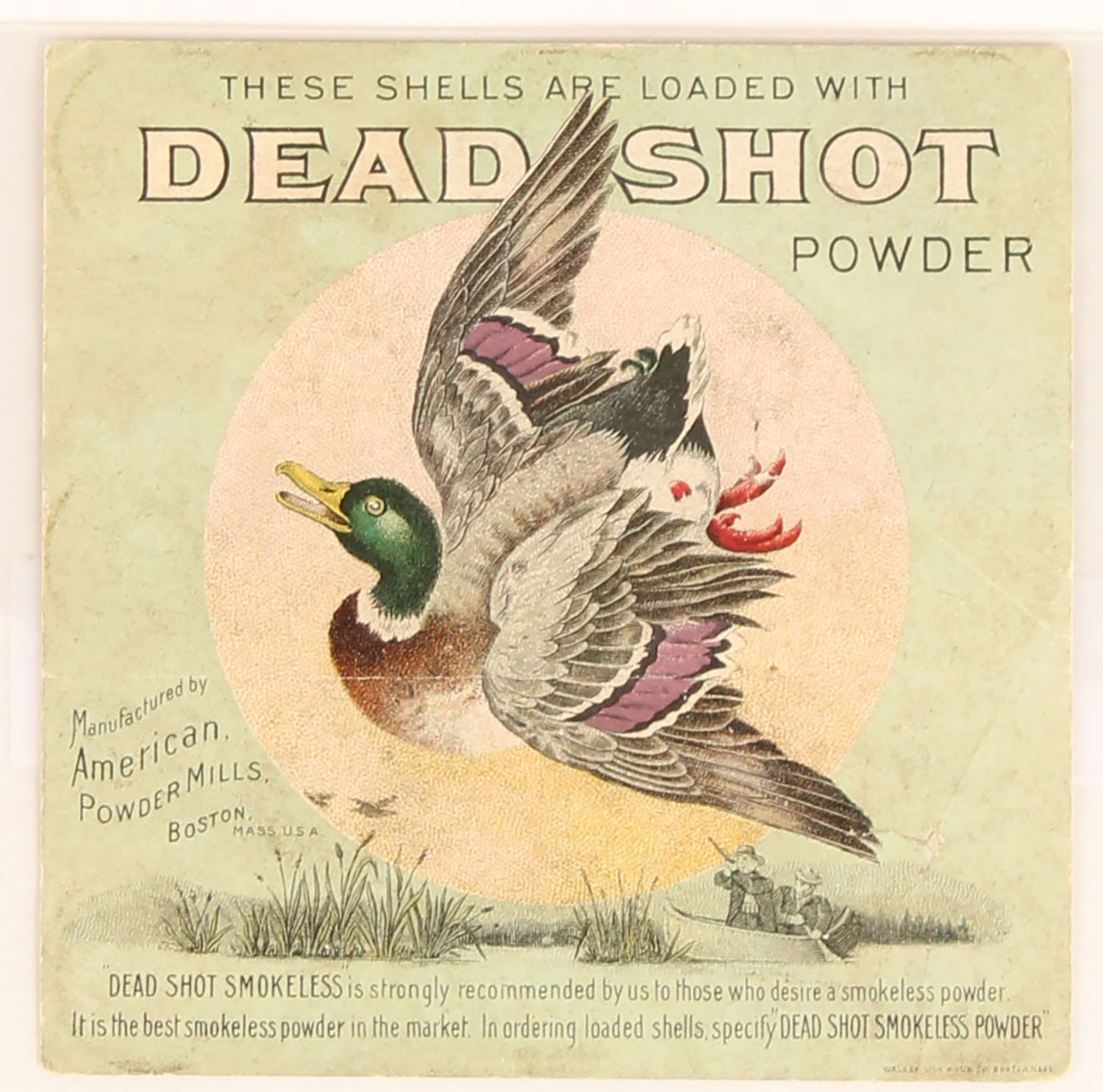 American Powder Mills DEAD SHOT Powder insert, has great full color image of falling mallard duck with hunters in background, back is marked ''DEAD SHOT''. Grade: Excellent - Value: 50 to 200