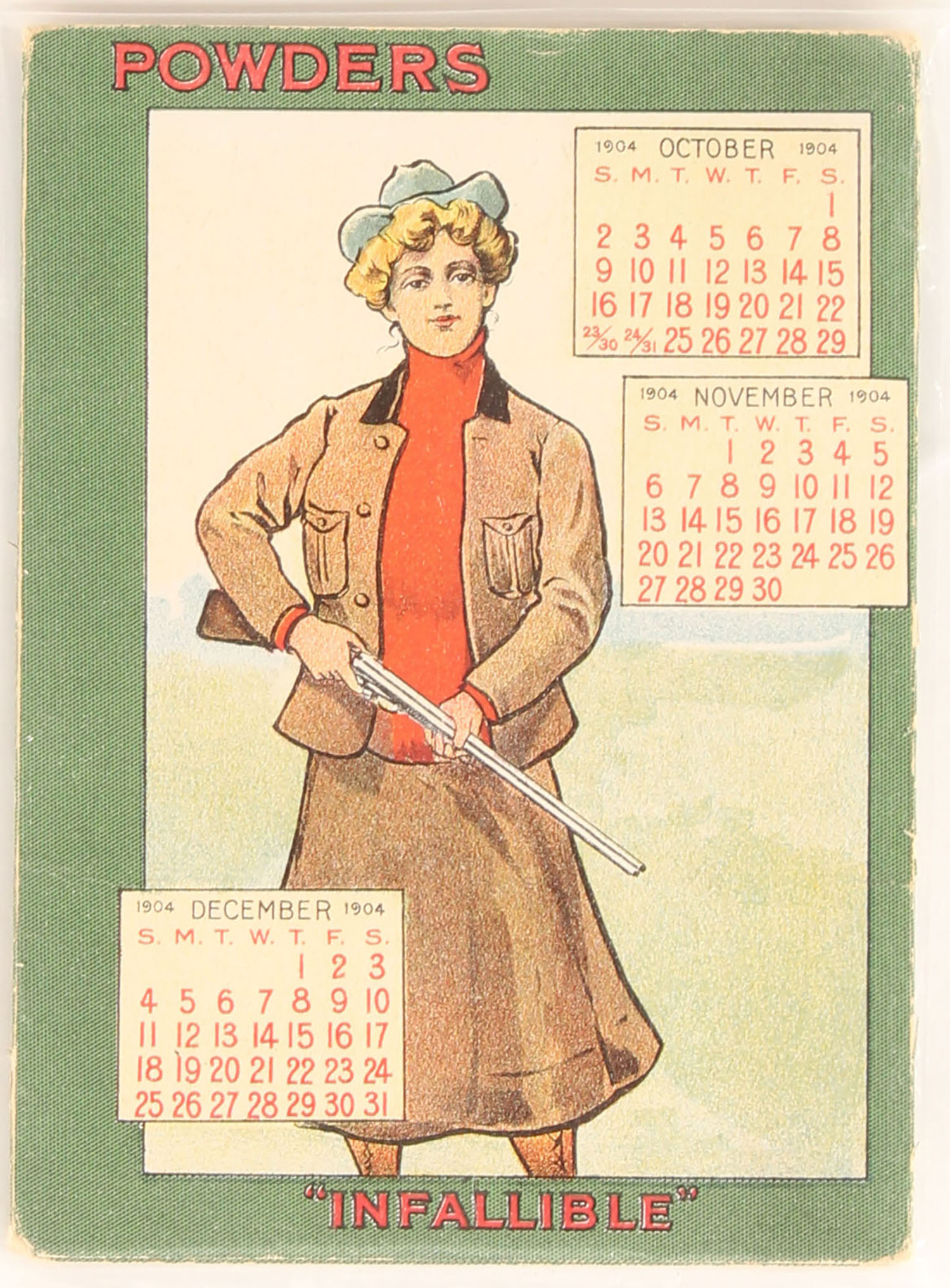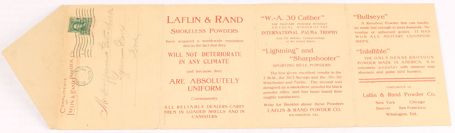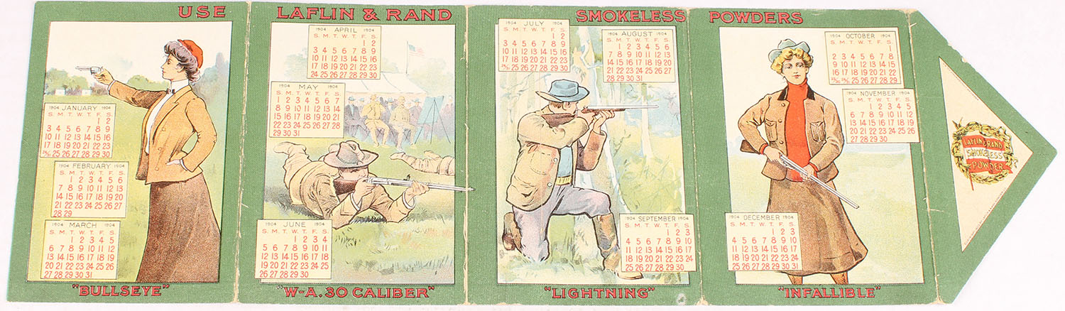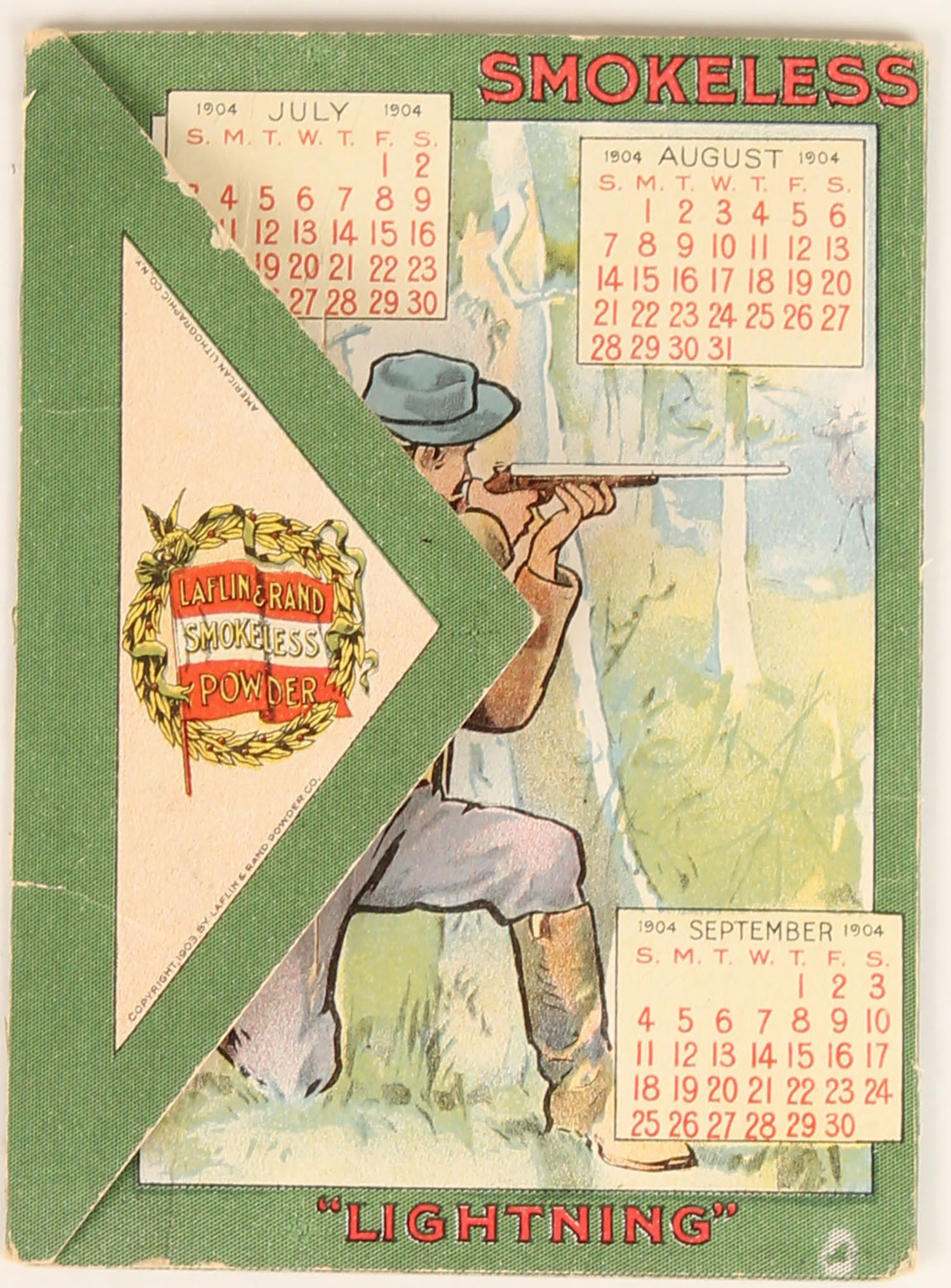 1904 Laflin & Rand Smokeless Powders Envelope / Calendar, one side pictures full color images of shooting scenes with calendar pages, the inside panels has red printed advertisements for powders, four panels total. Grade: Excellent - Value: 100 to 500