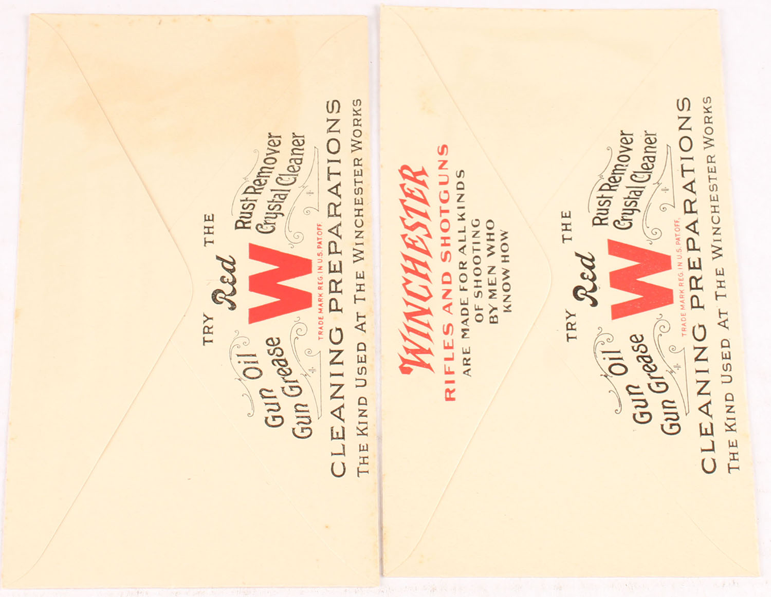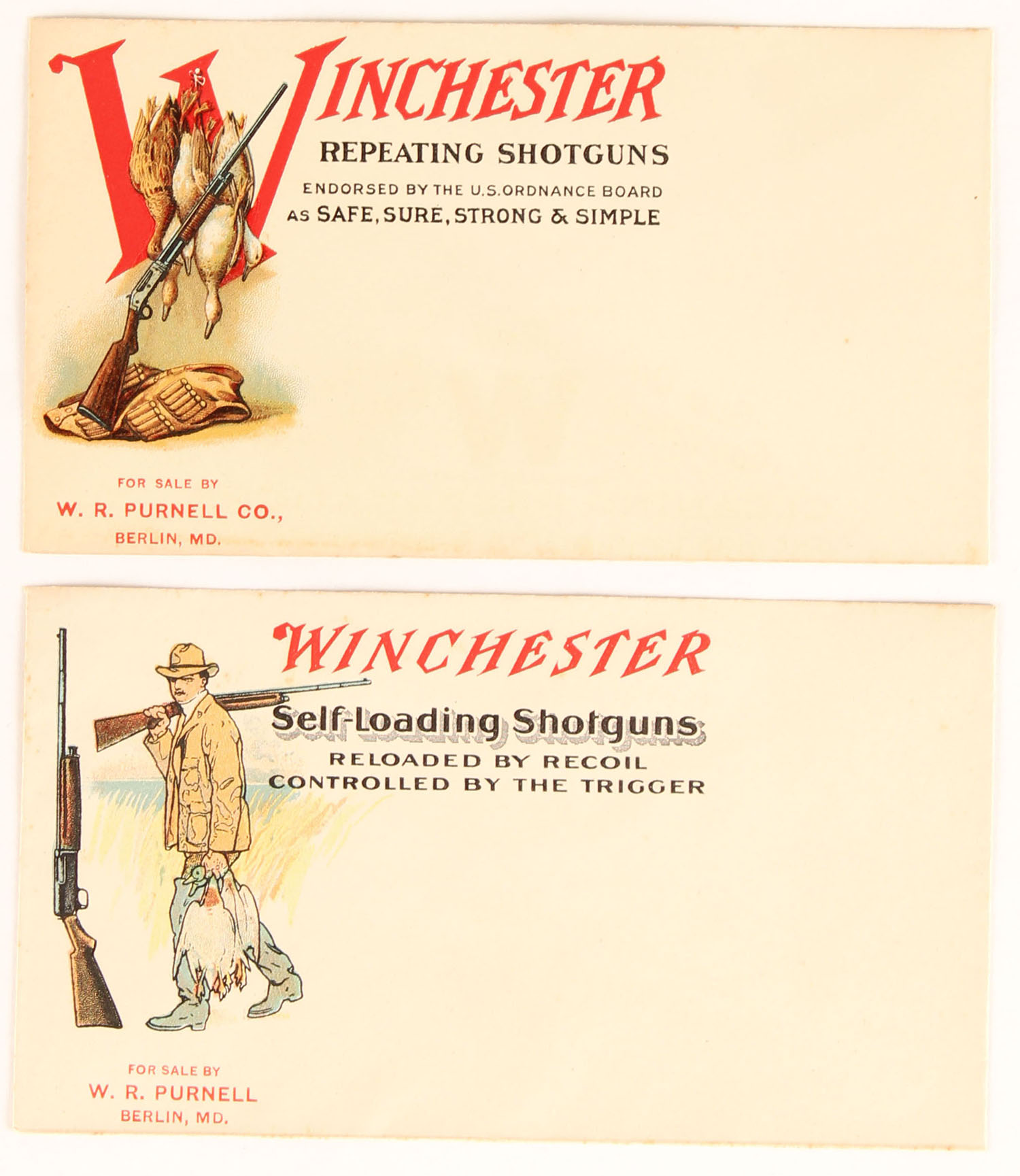 Winchester Self-Loading Shotgun Envelope, unused, full color image of duck hunters with two shotguns & a limit of mallards, back has red & black printing. Grade: Excellent - Value: 30 to 100