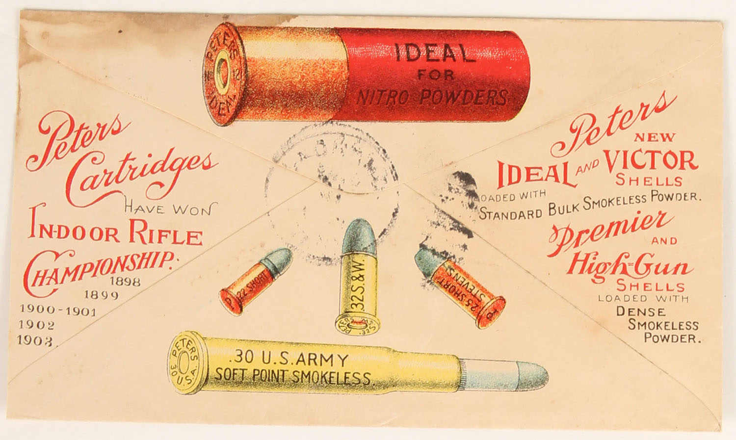 RARE Peters Cart. Co. Envelope, ''LOADED SHELLS FOR MARSH AND FIELD'', 1903 used, pictures full color image of mallard drake in flight, very colorful, shows some stains to top right, back has wonderful full color images of ammo. Grade: Very Good ++ - Value: 100 to 400