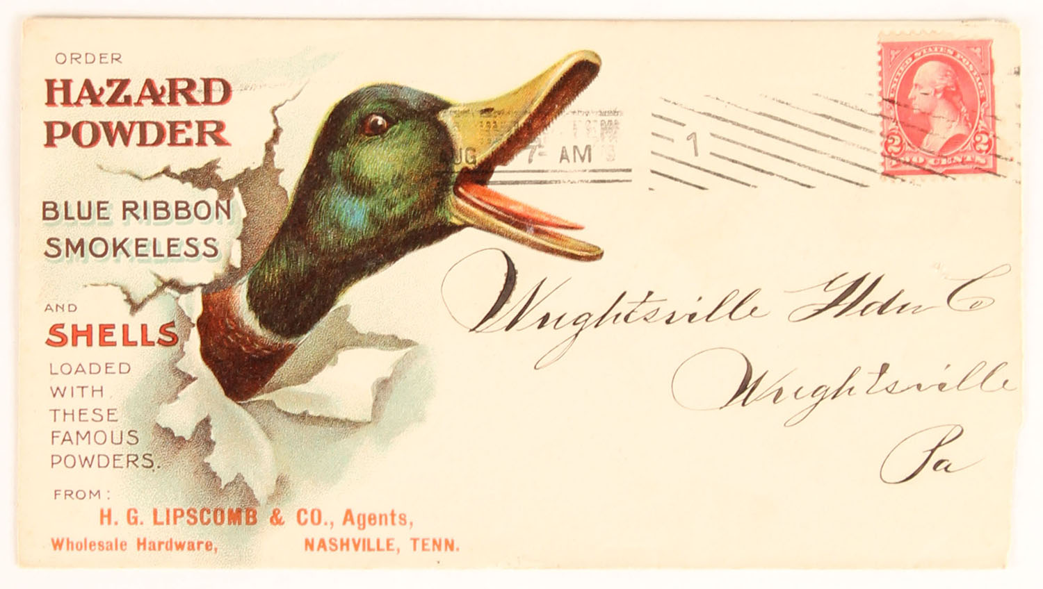 RARE Hazard Powder Co. Envelope, Blue Ribbon Smokeless, used dated 1897, has full color image of mallard drake with mouth wide open. Grade: Excellent - Value: 70 to 300