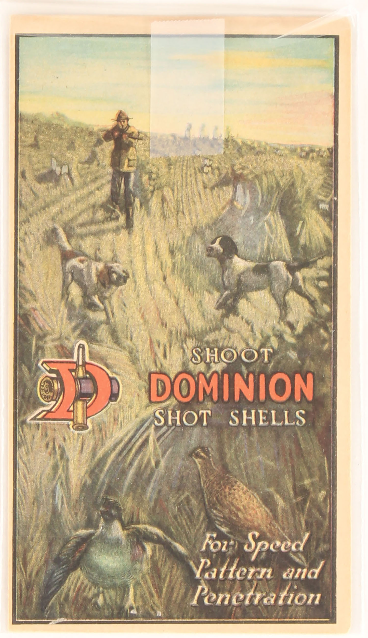 Dominion Shot Shell Envelope, unused, full color image of hunters in wheat fields with two dogs shooting at prairie chickens with Bent D Logo, back has Bent D Logo & some printing in color. Grade: Excellent ++ - Value: 100 to 300