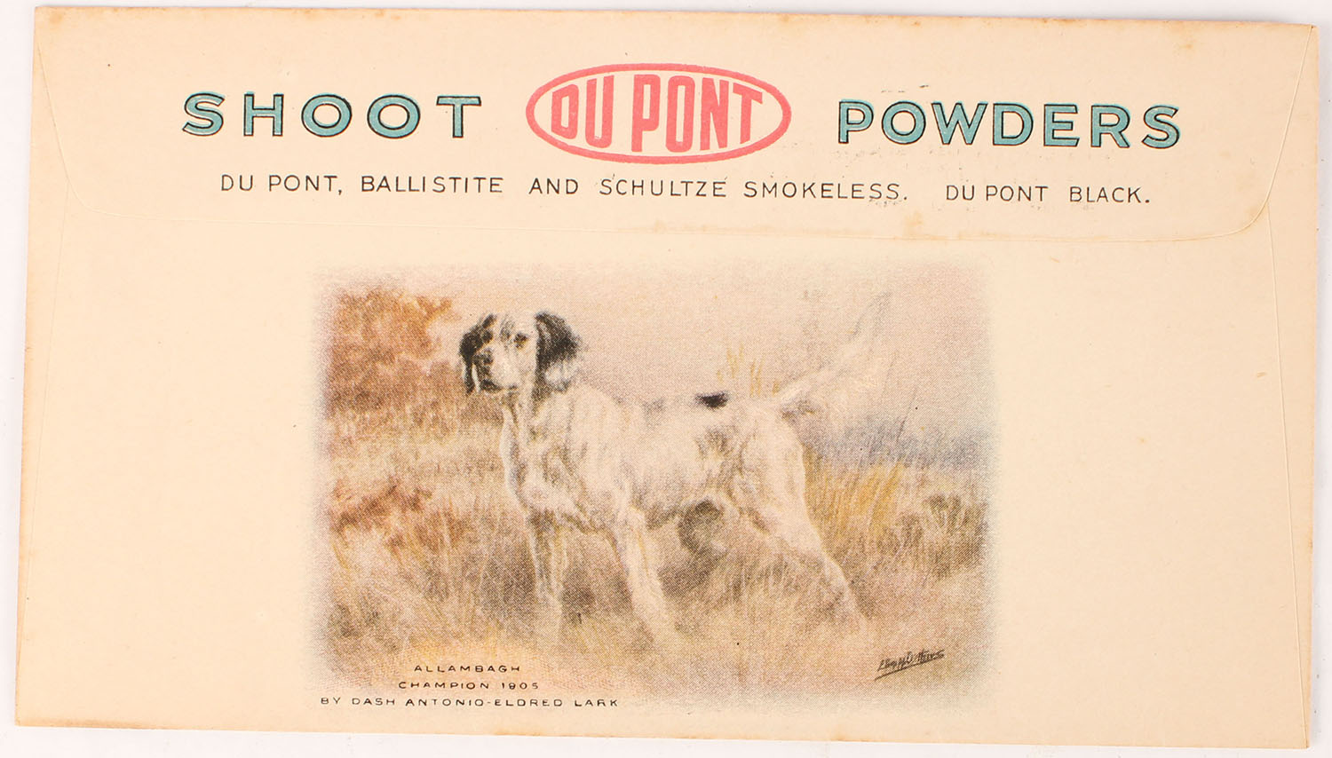 Shoot Dupont Powders Envelope, unused circa 1919, full color image on back of 1905 Champion ALLAMBAGH english setter on point, front return address for hardware Co. in Alabama, some age soiling. Grade: Very Good - Value: 50 to 400