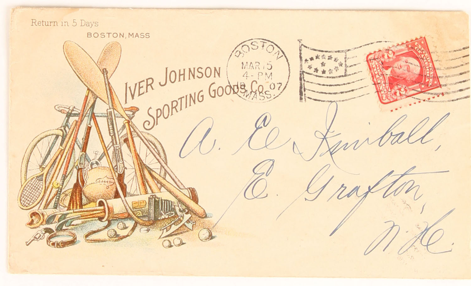 Iver Johnson Sporting Goods Co. Envelope, used 1907, full color image of sporting goods equipment, back has many full color hunting, fishing & sporting scenes. Grade: Excellent - Value: 50 to 300
