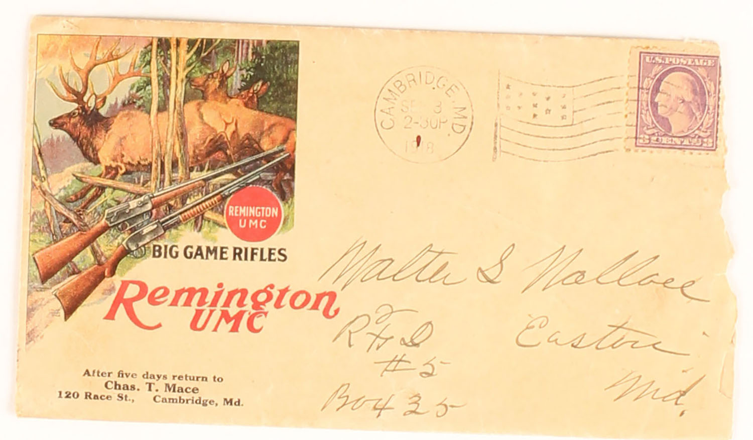 Remington UMC Envelope with advertising, wonderful full color image of bull elk in the woods & two remington rifles, back is unmarked, dated 1918, shows some age soiling with nice colors. Grade: Very Good ++ - Value: 40 to 200