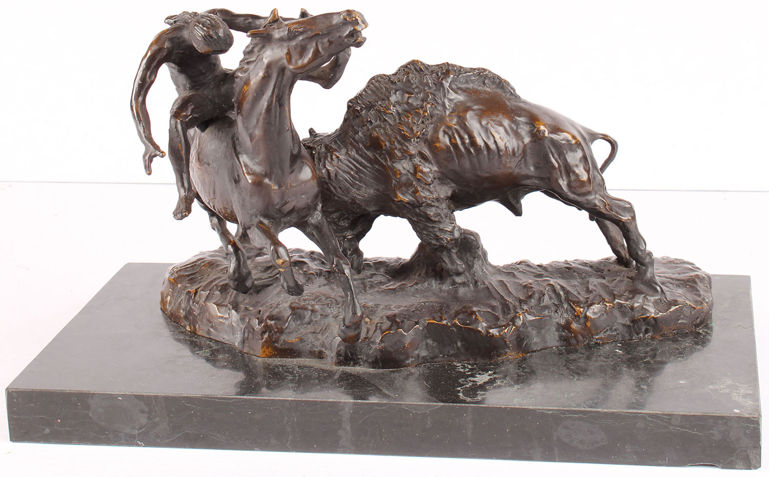Bronze by Charles Marion Russell, shows buffalo horning an Indians horse, has marble base, wonderful detail, 16'' x 9'' x 10'', also signed on base. Grade: Excellent ++ - Value: 200 to 1000