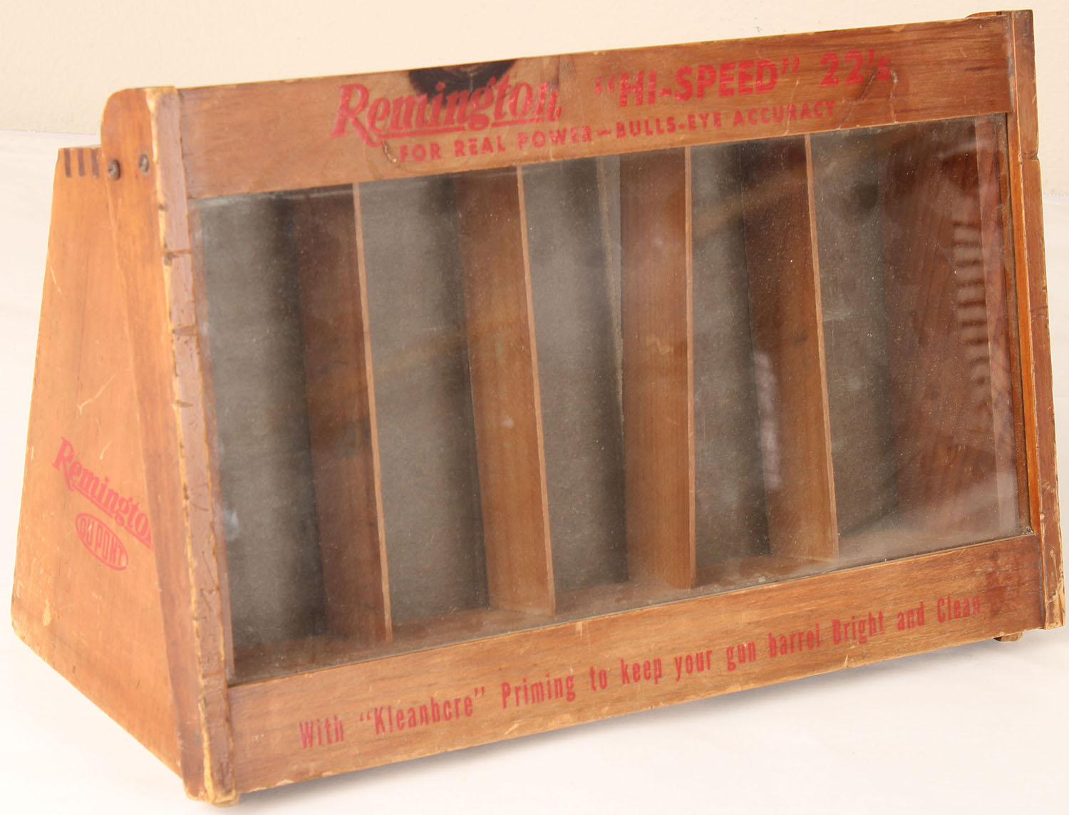 Remington High-Velocity 22's display, wood has some age soiling but still solid, nice red paint. Grade: Very Good + - Value: 200 to 400