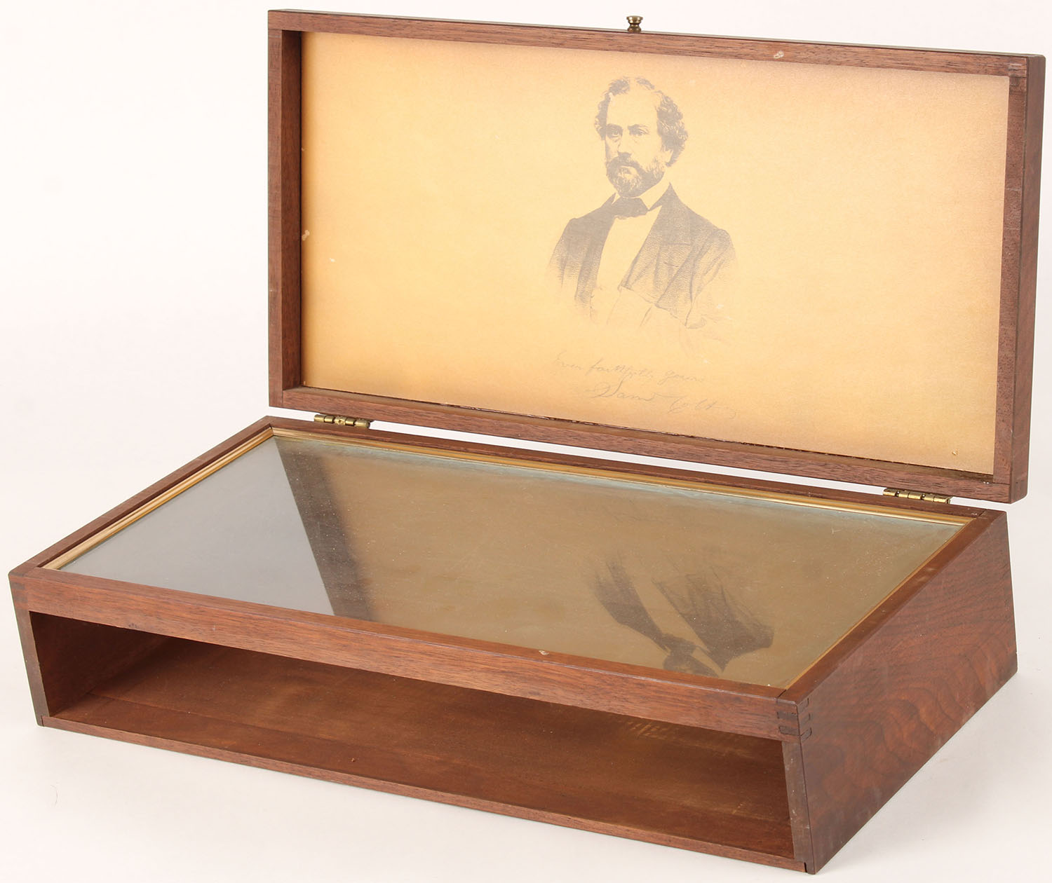 Wood display box for 1873 Peacemaker Centennial 1973 Cal 45 Colt, has lid with glass window into bottom. Grade: Excellent - Value: 40 to 250