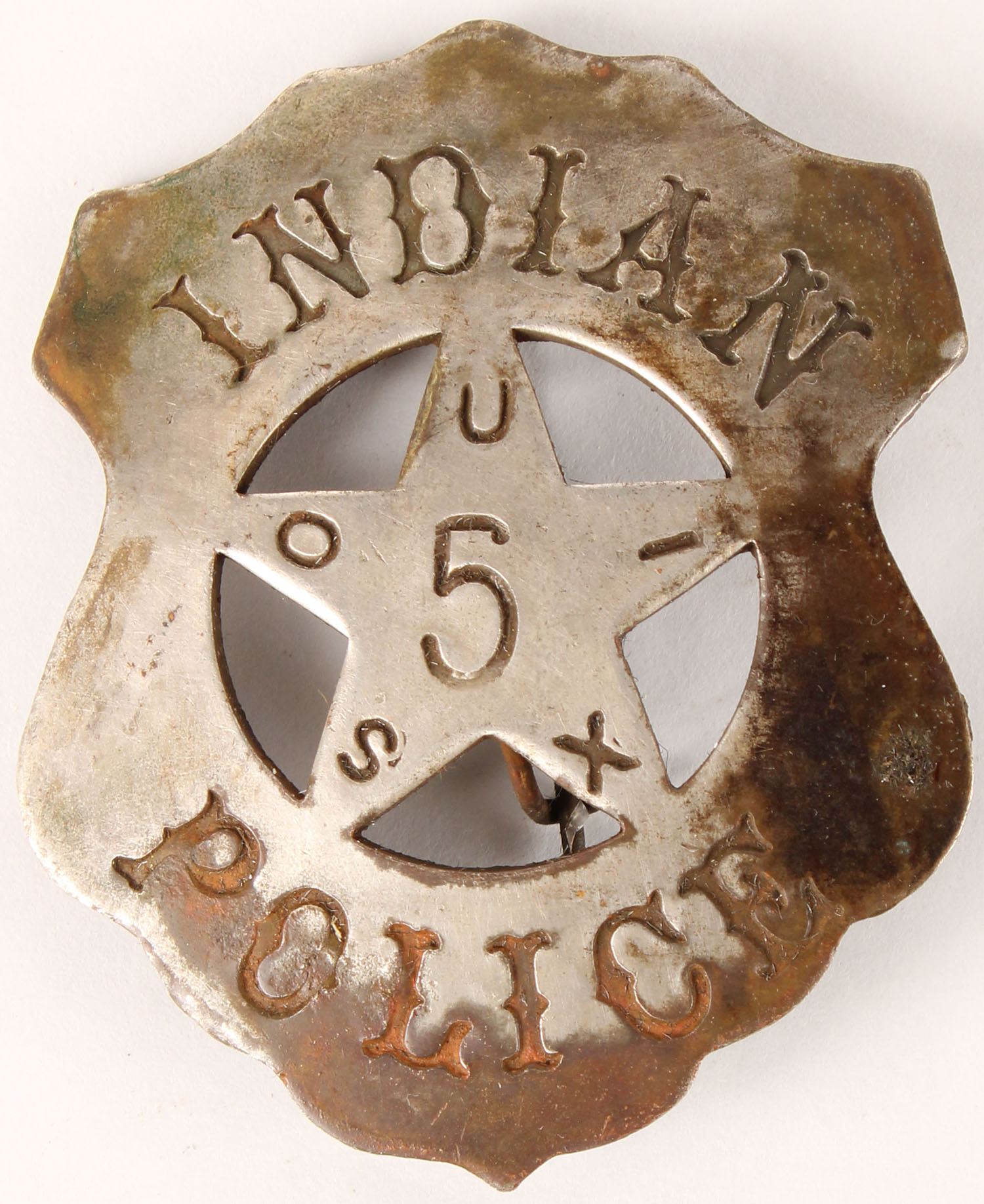 Sioux Indian Police badge #5 with pin back dated 1886, has rust. Grade: Very Good - Value: 50 to 300