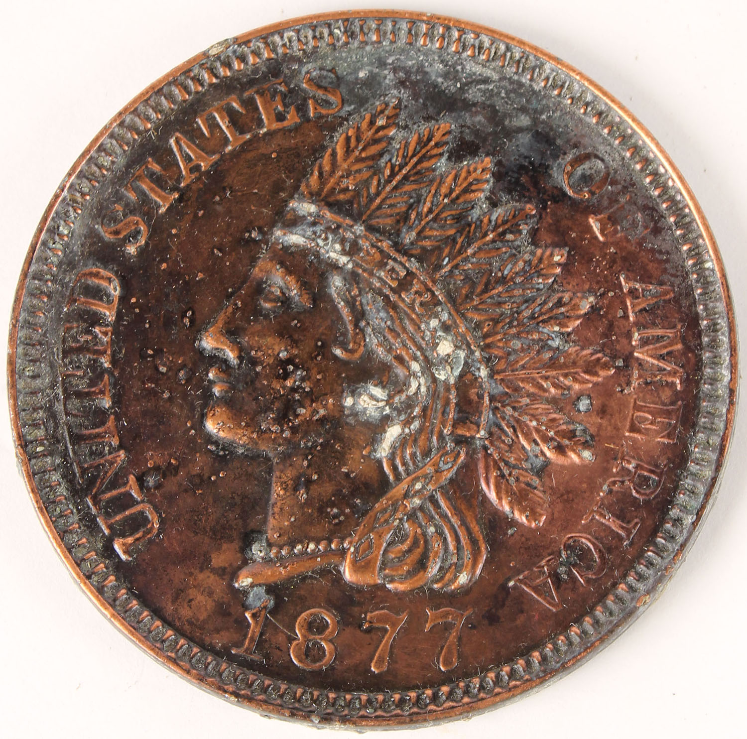 1877 3'' wide copper Indian head one cent piece, old premium give away with groceries. Grade: Very Good - Value: 40 to 100