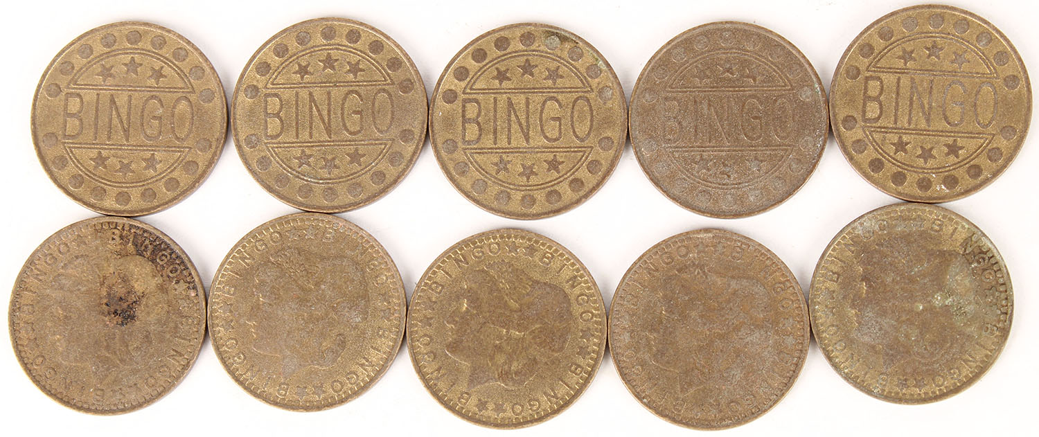 Lot of 10 vintage bingo medal tokens. Grade: Very Good - Value: 10 to 50