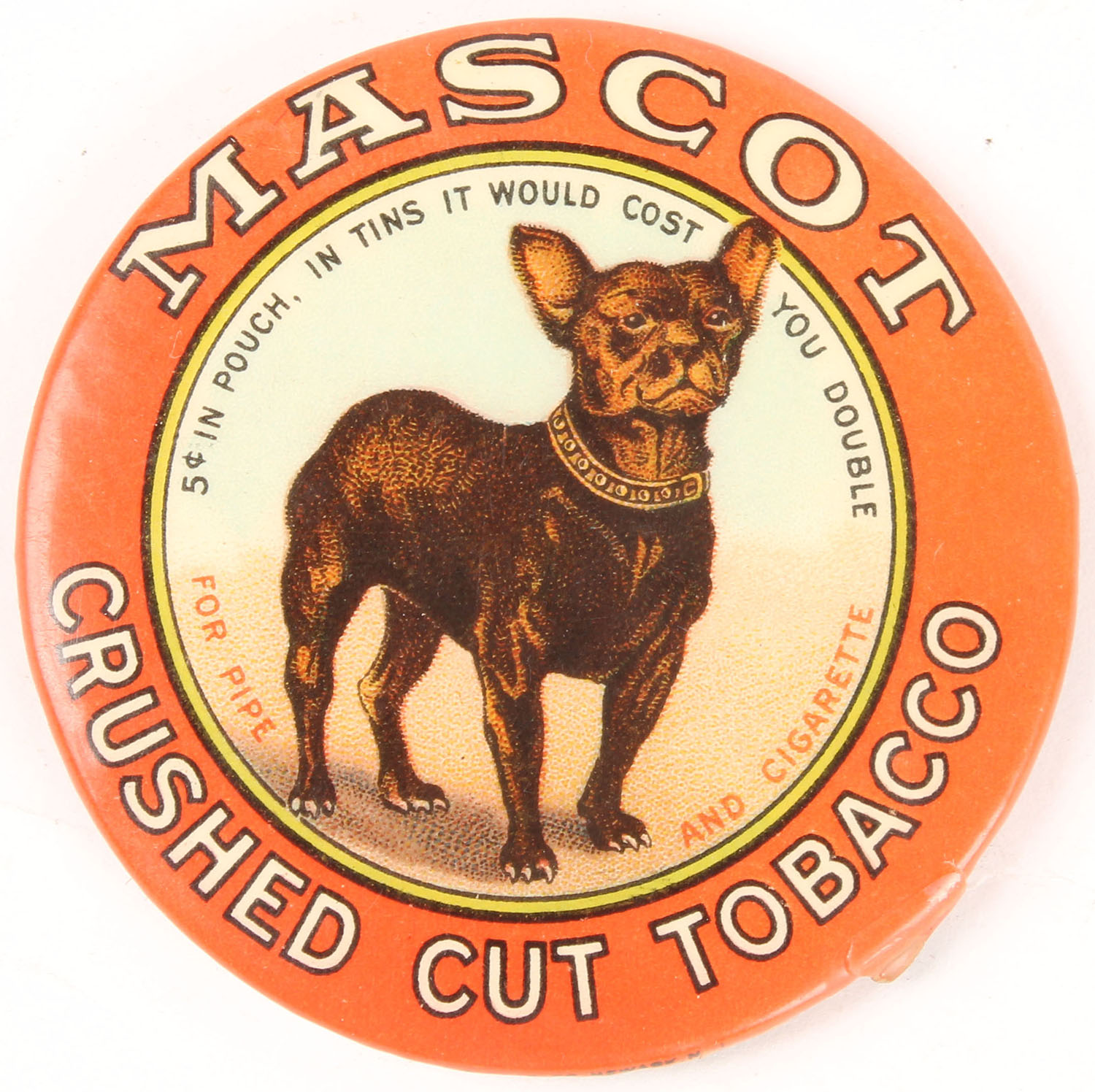 Mascot Crushed cut tobacco 2'' wide pin with old photo of woman and baby on back. Grade: Very Good - Value: 10 to 100