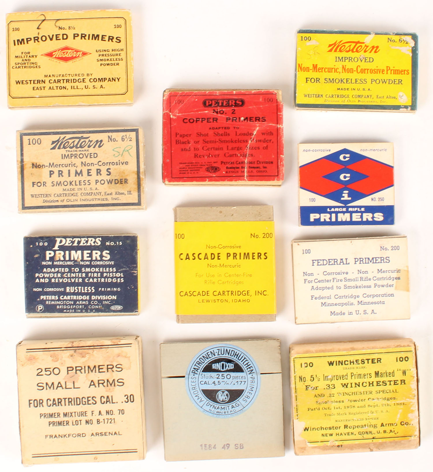 Large lot of primer boxes, 6 Full & Sealed, 4 partial and 1 Full. Grade: Very Good ++ - Value: 6 to 40