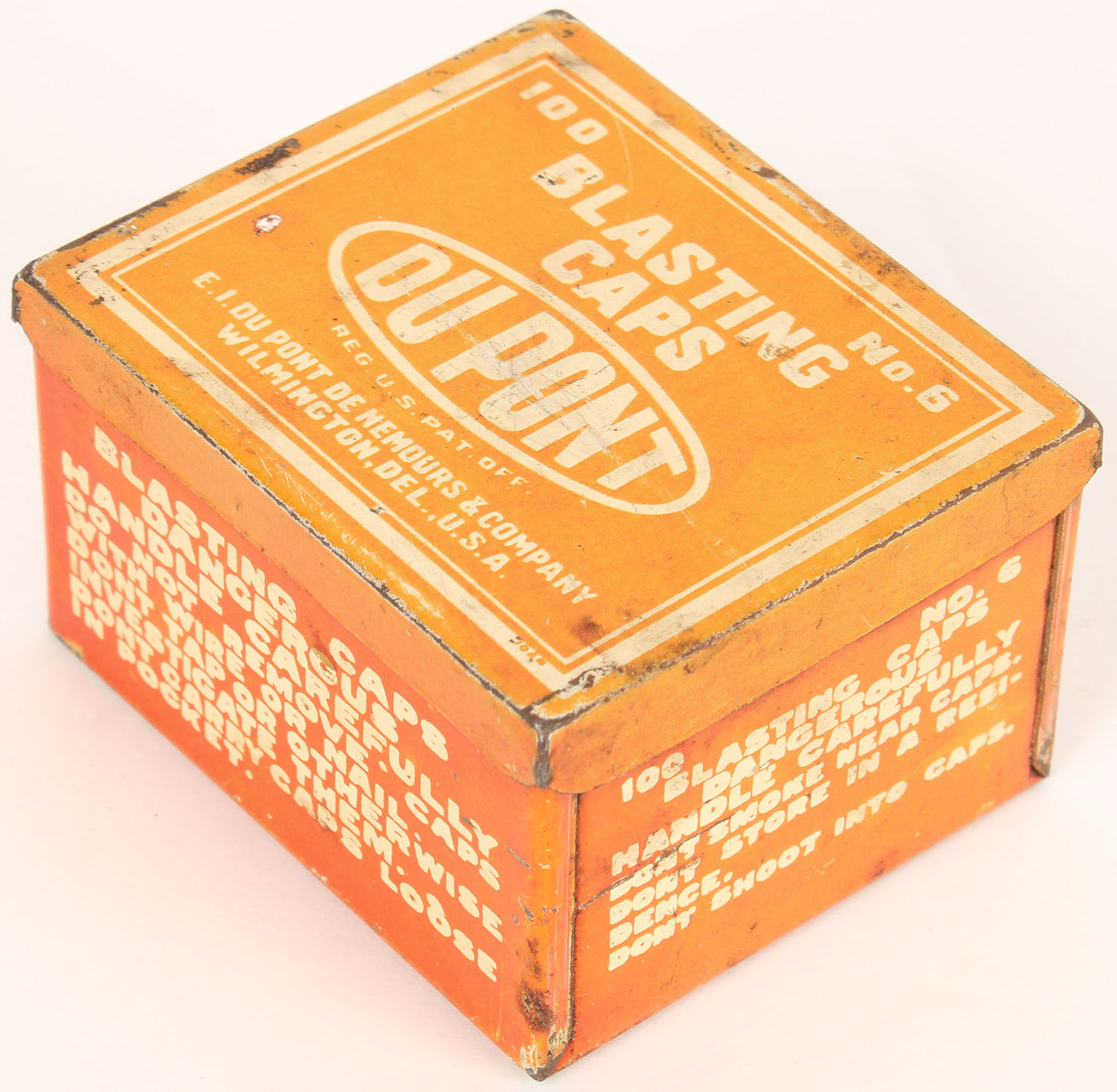 Empty Dupont Powder Mfg Co. Blasting Caps, No. 6, tin has edge wear. Grade: Very Good - Value: 6 to 40