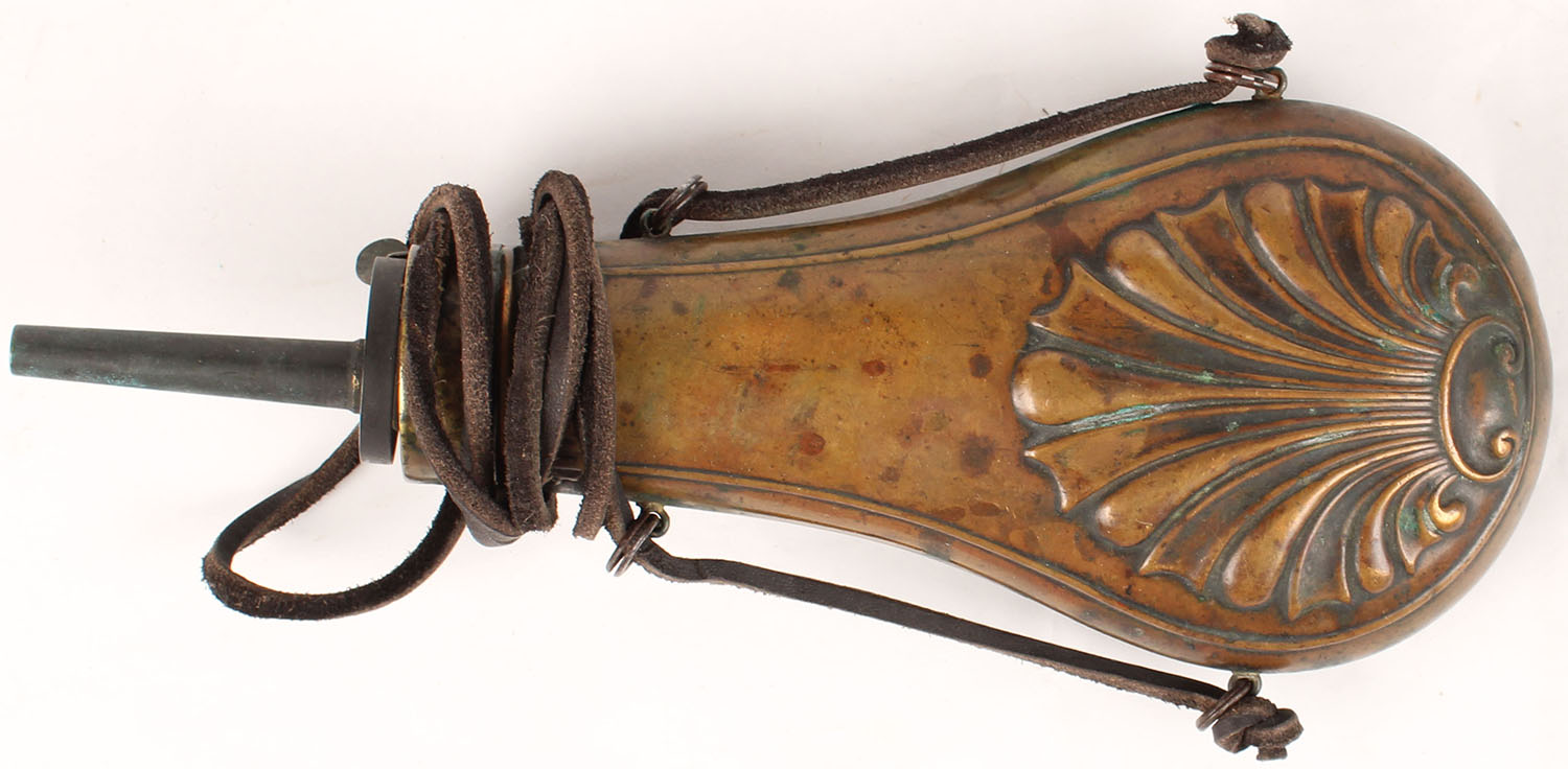 Brass powder flask, has age soiling, Empty. Grade: Very Good - Value: 20 to 50