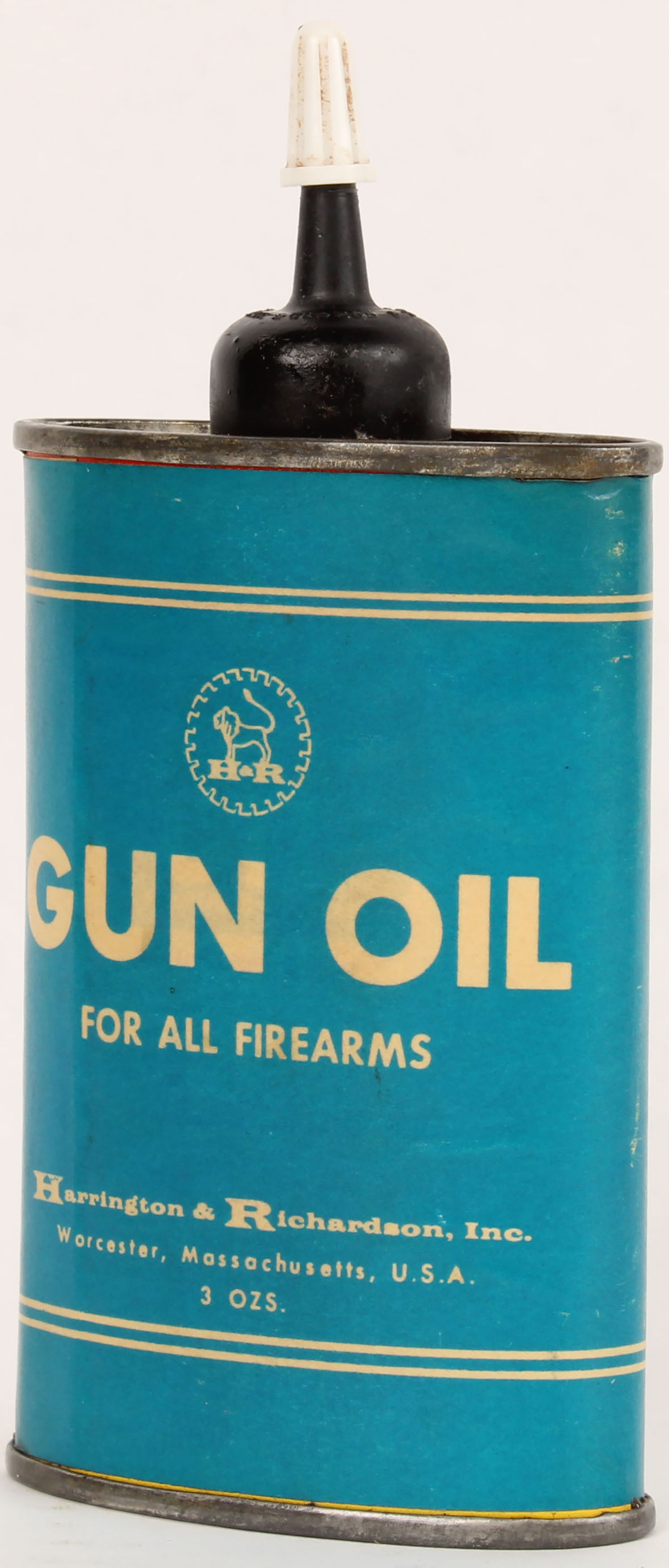 RARE! H&R Gun Oil, Empty oil tin, lead spout and plastic cap, very bright and clean. Grade: Excellent - Value: 20 to 100