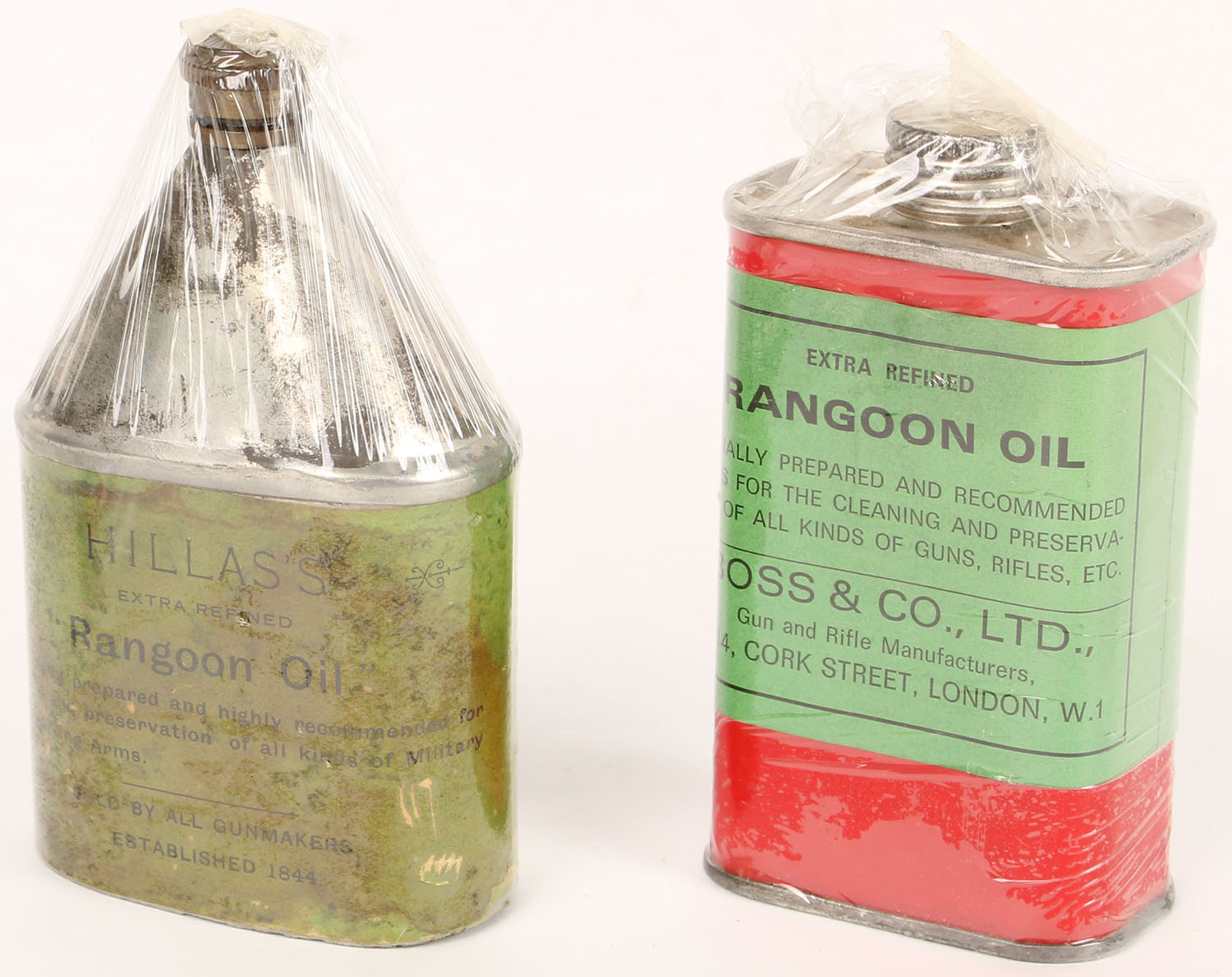 Lot of 2 Rangoon Oil, nearly Full oil tin, 1 has age soiling and 1 is bright and clean. Grade: Excellent - Value: 20 to 100