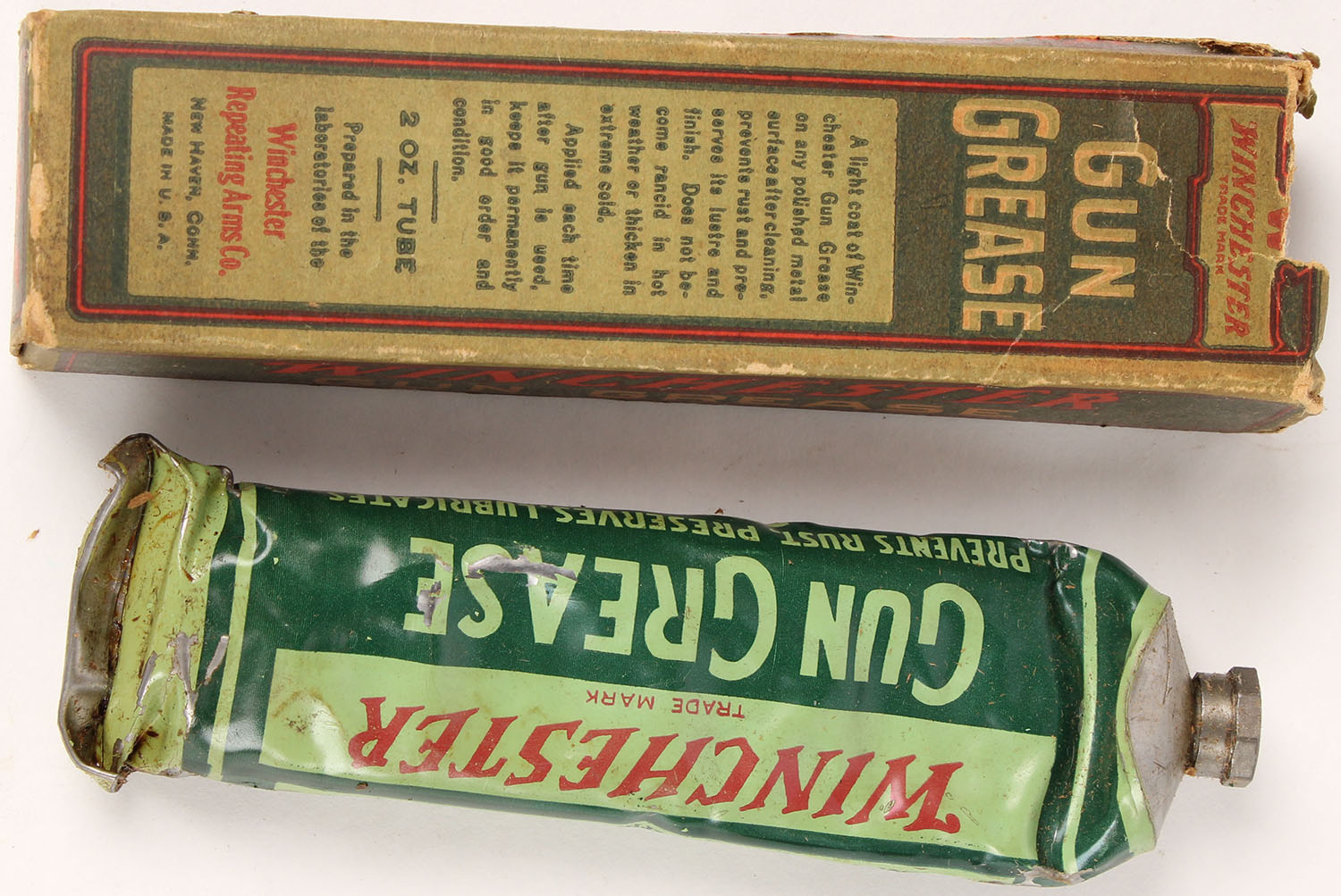 Winchester Gun Grease tube, in original box, tube has scuffing with some use and box has lots of age soiling and scuffing. Grade: Very Good - Value: 20 to 60